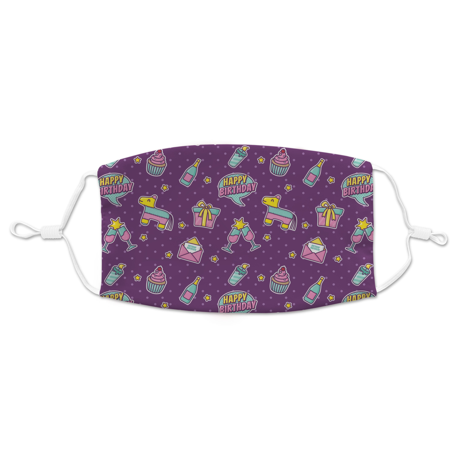This is a two-pattern design and is split right down the middle. The left design is a bright purple with all kinds of birthday graphics including piñatas, "happy birthday" speech bubbles, presents, cupcakes and more! It also has a subtle purple polka dot pattern in the background. To compliment the polka dots, the secondary pattern is a mint green with white polka dots. Your personalization goes in the bottom right hand side, giving the design an asymmetrical feeling.