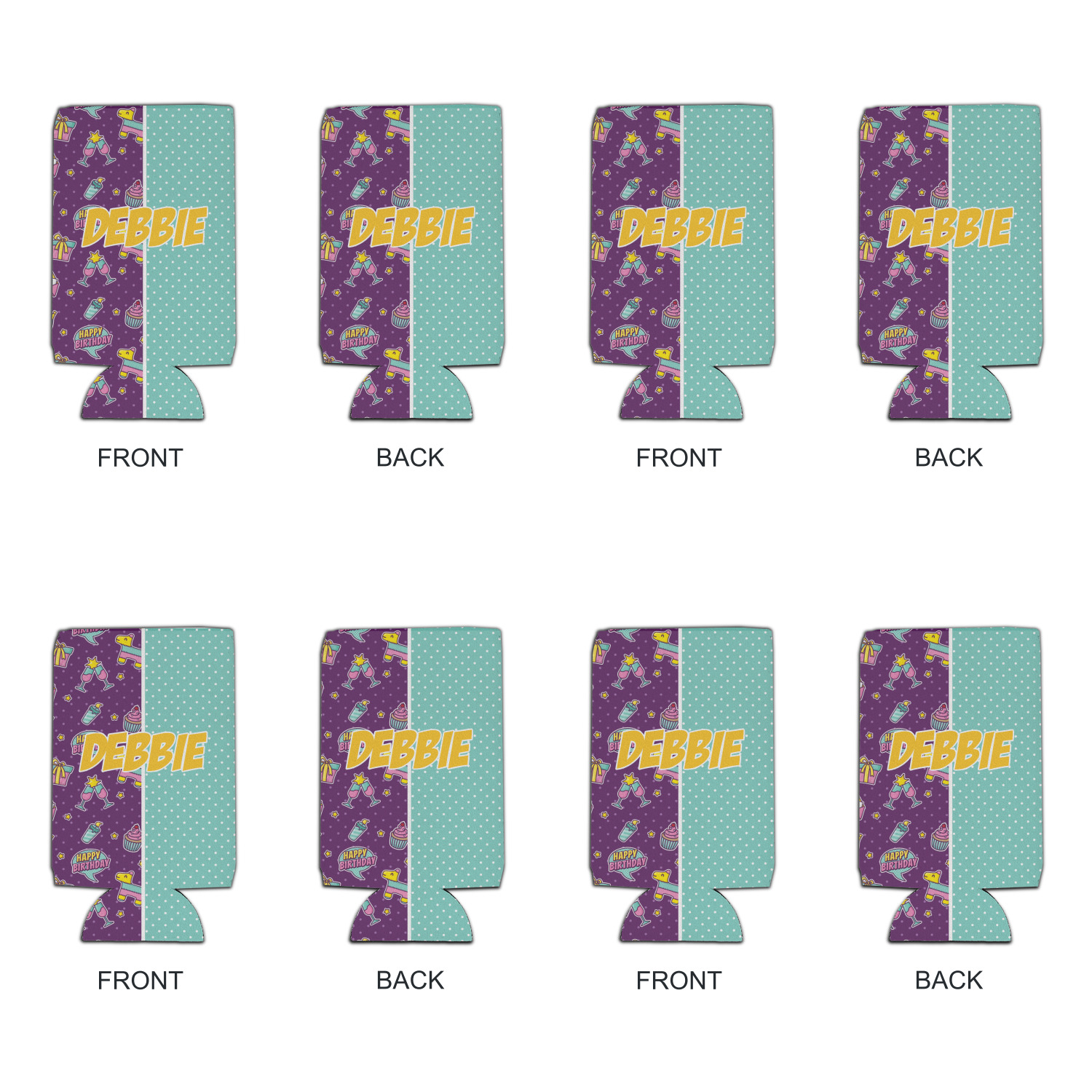 This is a two-pattern design and is split right down the middle. The left design is a bright purple with all kinds of birthday graphics including piñatas, "happy birthday" speech bubbles, presents, cupcakes and more! It also has a subtle purple polka dot pattern in the background. To compliment the polka dots, the secondary pattern is a mint green with white polka dots. Your personalization goes in the bottom right hand side, giving the design an asymmetrical feeling.