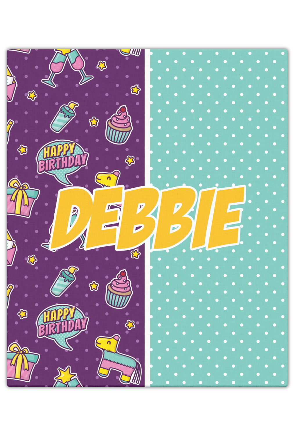 This is a two-pattern design and is split right down the middle. The left design is a bright purple with all kinds of birthday graphics including piñatas, "happy birthday" speech bubbles, presents, cupcakes and more! It also has a subtle purple polka dot pattern in the background. To compliment the polka dots, the secondary pattern is a mint green with white polka dots. Your personalization goes in the bottom right hand side, giving the design an asymmetrical feeling.