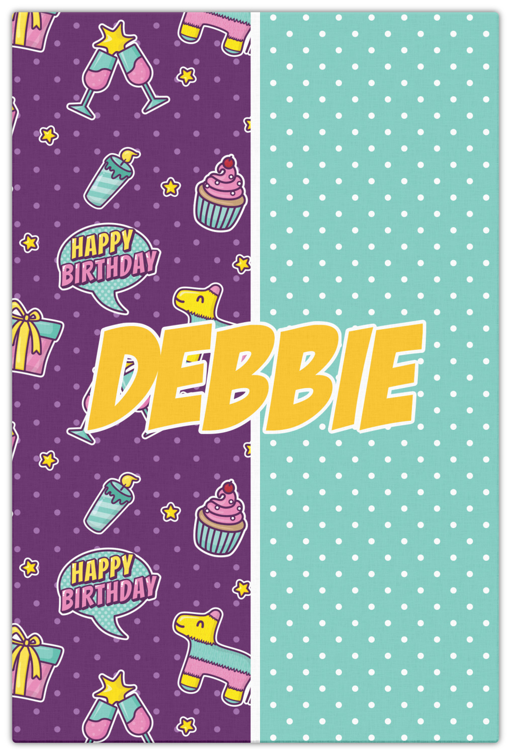 This is a two-pattern design and is split right down the middle. The left design is a bright purple with all kinds of birthday graphics including piñatas, "happy birthday" speech bubbles, presents, cupcakes and more! It also has a subtle purple polka dot pattern in the background. To compliment the polka dots, the secondary pattern is a mint green with white polka dots. Your personalization goes in the bottom right hand side, giving the design an asymmetrical feeling.