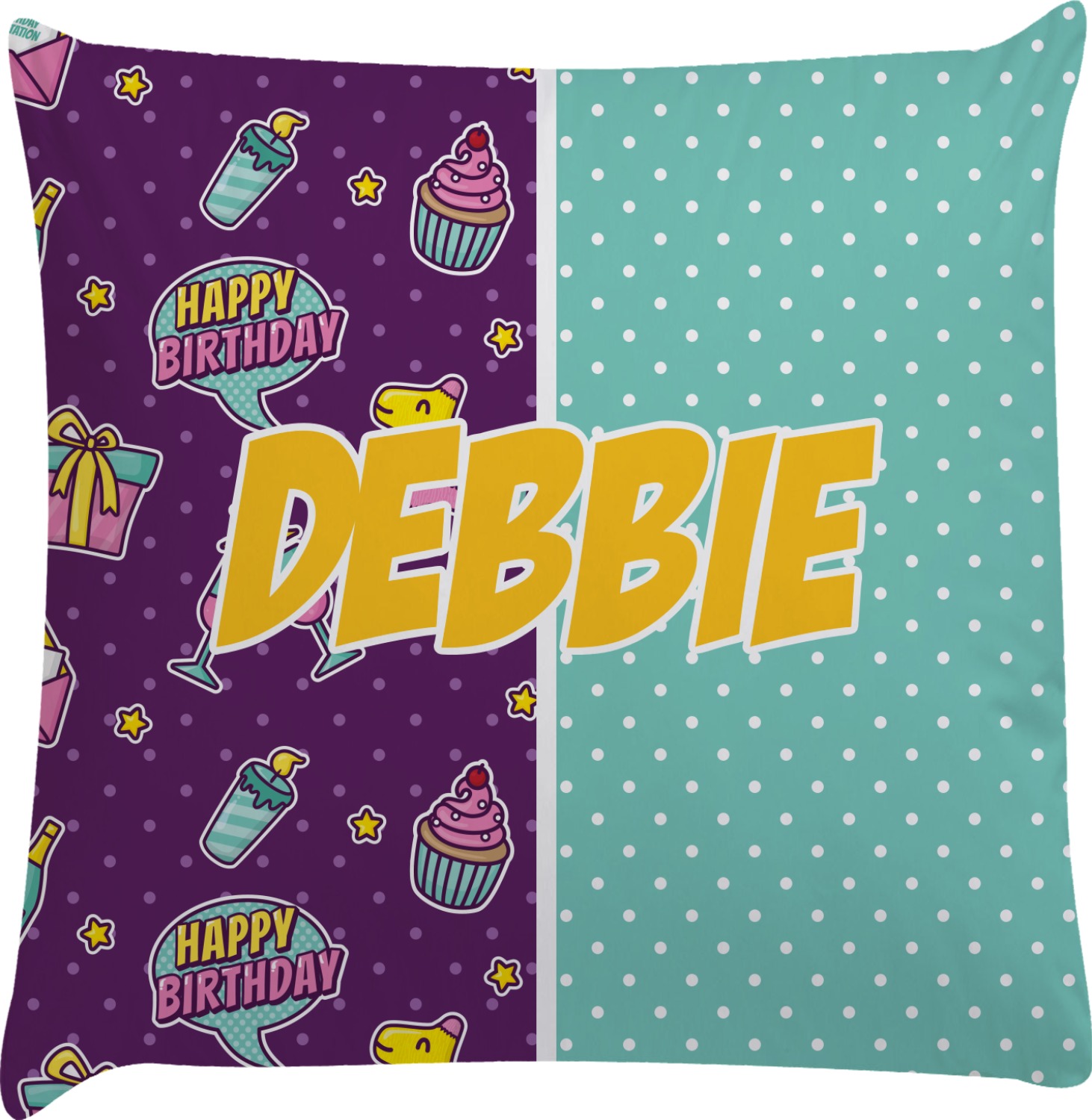This is a two-pattern design and is split right down the middle. The left design is a bright purple with all kinds of birthday graphics including piñatas, "happy birthday" speech bubbles, presents, cupcakes and more! It also has a subtle purple polka dot pattern in the background. To compliment the polka dots, the secondary pattern is a mint green with white polka dots. Your personalization goes in the bottom right hand side, giving the design an asymmetrical feeling.
