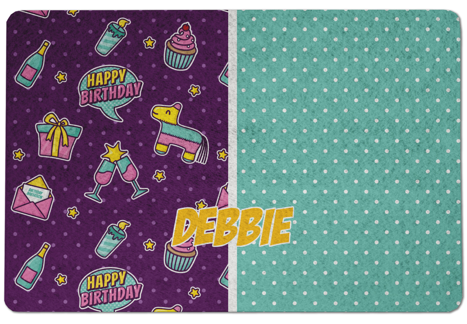 This is a two-pattern design and is split right down the middle. The left design is a bright purple with all kinds of birthday graphics including piñatas, "happy birthday" speech bubbles, presents, cupcakes and more! It also has a subtle purple polka dot pattern in the background. To compliment the polka dots, the secondary pattern is a mint green with white polka dots. Your personalization goes in the bottom right hand side, giving the design an asymmetrical feeling.