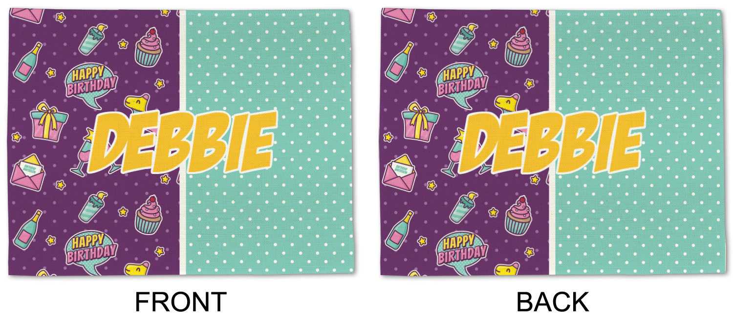 This is a two-pattern design and is split right down the middle. The left design is a bright purple with all kinds of birthday graphics including piñatas, "happy birthday" speech bubbles, presents, cupcakes and more! It also has a subtle purple polka dot pattern in the background. To compliment the polka dots, the secondary pattern is a mint green with white polka dots. Your personalization goes in the bottom right hand side, giving the design an asymmetrical feeling.