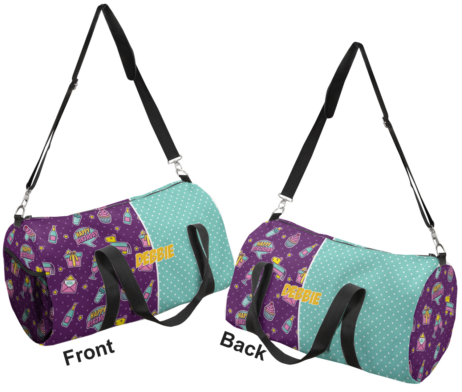 This duffle is a sturdy bag made of a canvas material. It comes in two sizes: Small (19"W x 9.5"H x 9.5"D) and Large (23"W x 12"H x 12"D). The bag is a cylindrical shape with a black adjustable strap and two handles. On one side is an elastic pouch to put a waterbottle or other small item. Your product will be sublimated with your design and is able to be designed on the front, back, and sides. Be sure to remember that the straps may cut into parts of your design if you upload your own artwork.