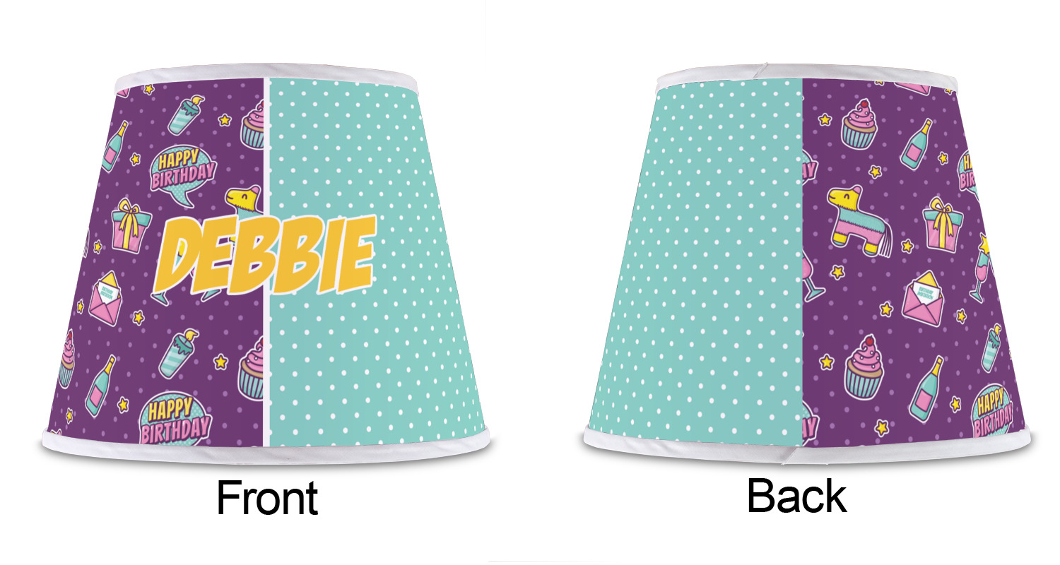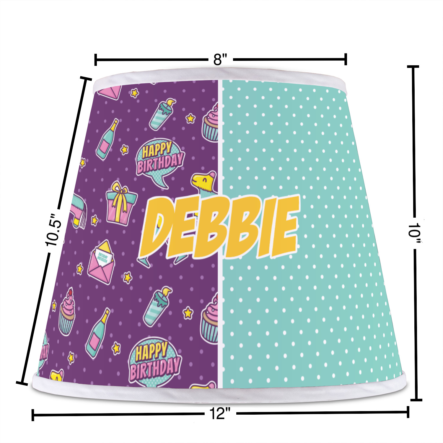 The base of this lampshade is 12 inches in diameter, and the top spans 8 inches in diameter. The total height of the lampshade is 10 inches. The angled nature of this custom lampshade concentrates the light, making it ideal for smaller spaces. This lampshade is made of matte, polyfilm, and displays your customization in its middle. The top and bottom of this colorful lamp shade are lined with a white fabric ribbon (which can be replaced with black inside the design studio) which frames your design and creates a sophisticated finish. As an UNO fitter lampshade, this unique lamp shade will fit a variety of bases.