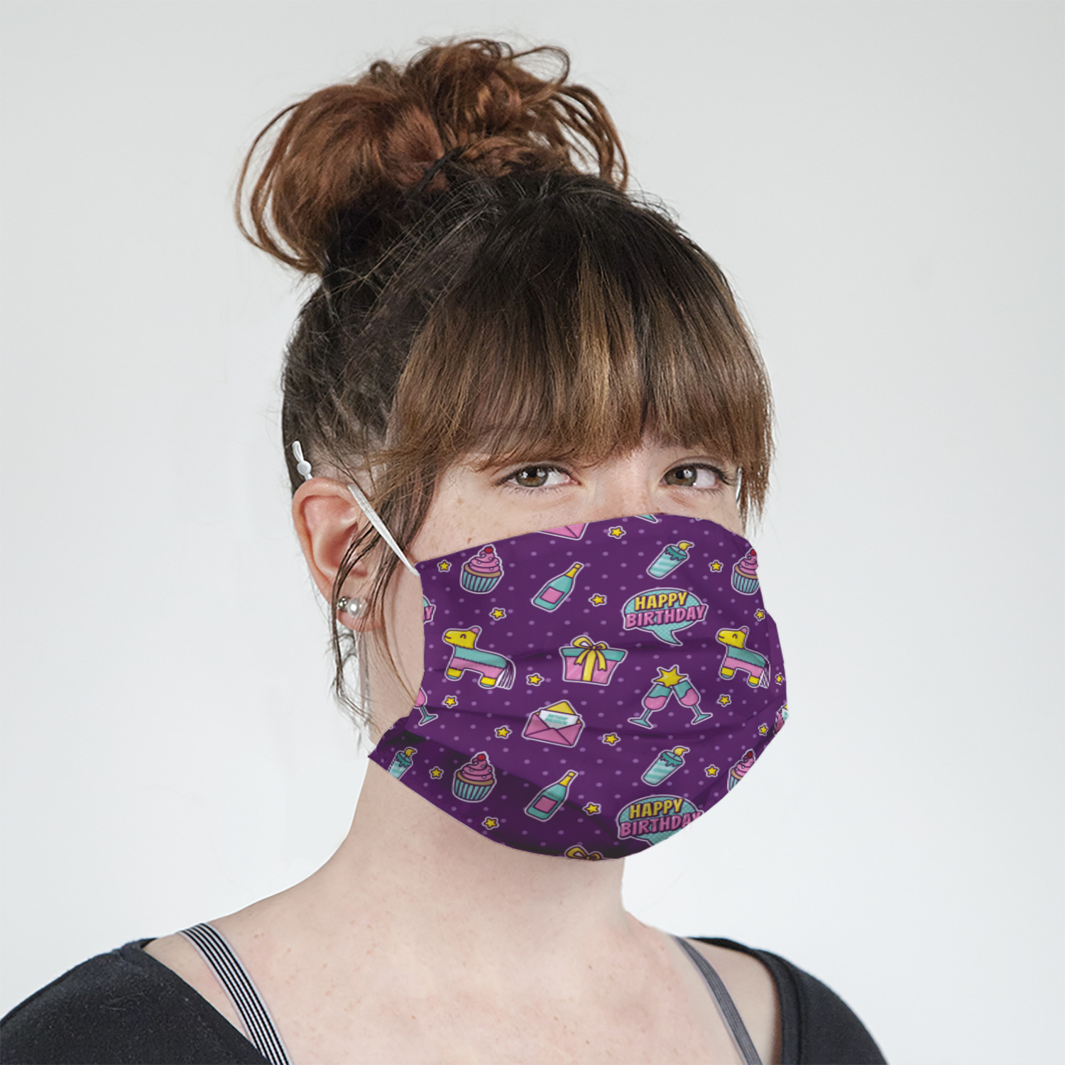 These fun face masks are 7" wide and 3.5" high. They feature pleats, adjustable ear loops, and are made with two layers of fabric. The top layer where your design is printed is a breathable polyester sheeting, while the inside layer is a soft microfiber polyester