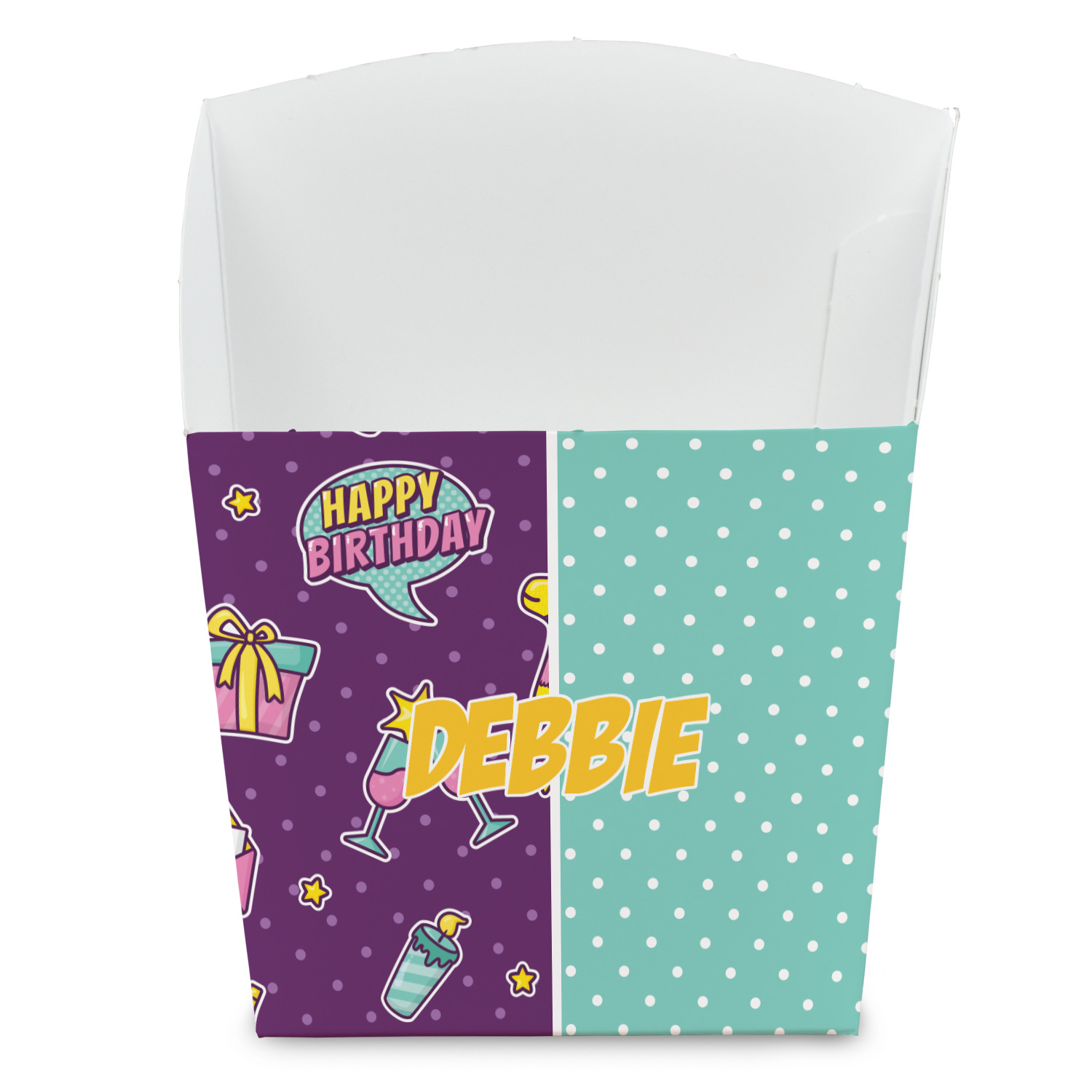 Since it is an open box, it works very well as a party snack cup (instead of plates) for different types of dry snacks and treats such as popcorn, cheezies, pretzels, chips, twizzlers, etc. This box can easily be carried with a drink all in one hand!