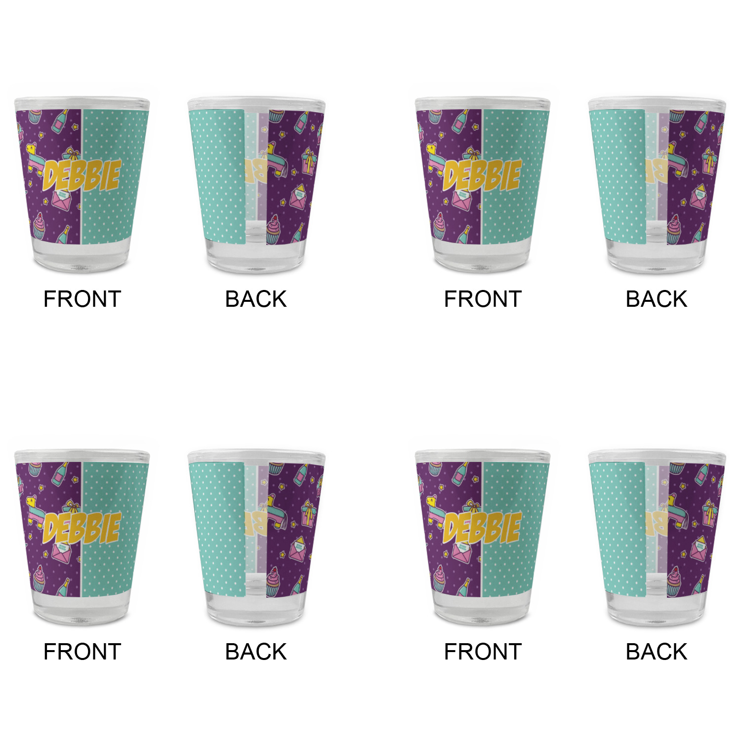 Made with frosted glass, these shot glasses are printed in full color with the design of your choice. They are a standard 1.5oz shot glass and are 2.4" tall. The print is wrapped around the shot glass in a full wrap and boldly displays your customization.