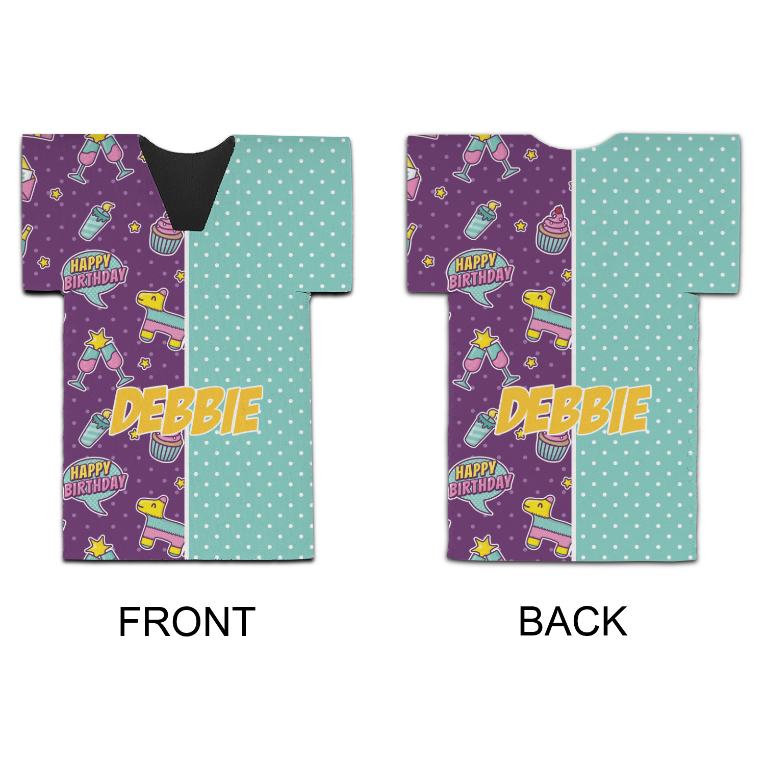 This is a two-pattern design and is split right down the middle. The left design is a bright purple with all kinds of birthday graphics including piñatas, "happy birthday" speech bubbles, presents, cupcakes and more! It also has a subtle purple polka dot pattern in the background. To compliment the polka dots, the secondary pattern is a mint green with white polka dots. Your personalization goes in the bottom right hand side, giving the design an asymmetrical feeling.