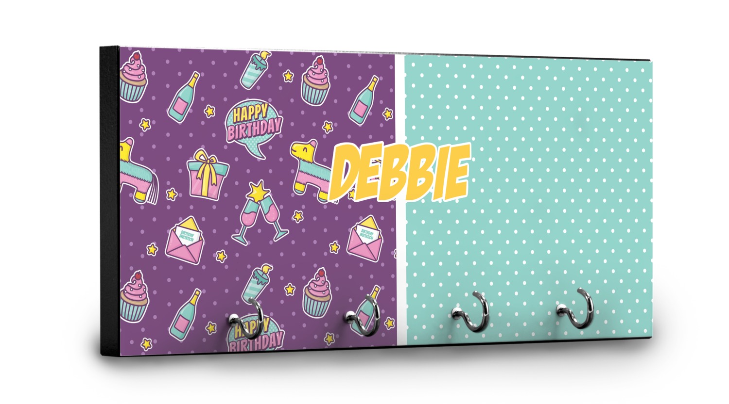 This is a two-pattern design and is split right down the middle. The left design is a bright purple with all kinds of birthday graphics including piñatas, "happy birthday" speech bubbles, presents, cupcakes and more! It also has a subtle purple polka dot pattern in the background. To compliment the polka dots, the secondary pattern is a mint green with white polka dots. Your personalization goes in the bottom right hand side, giving the design an asymmetrical feeling.