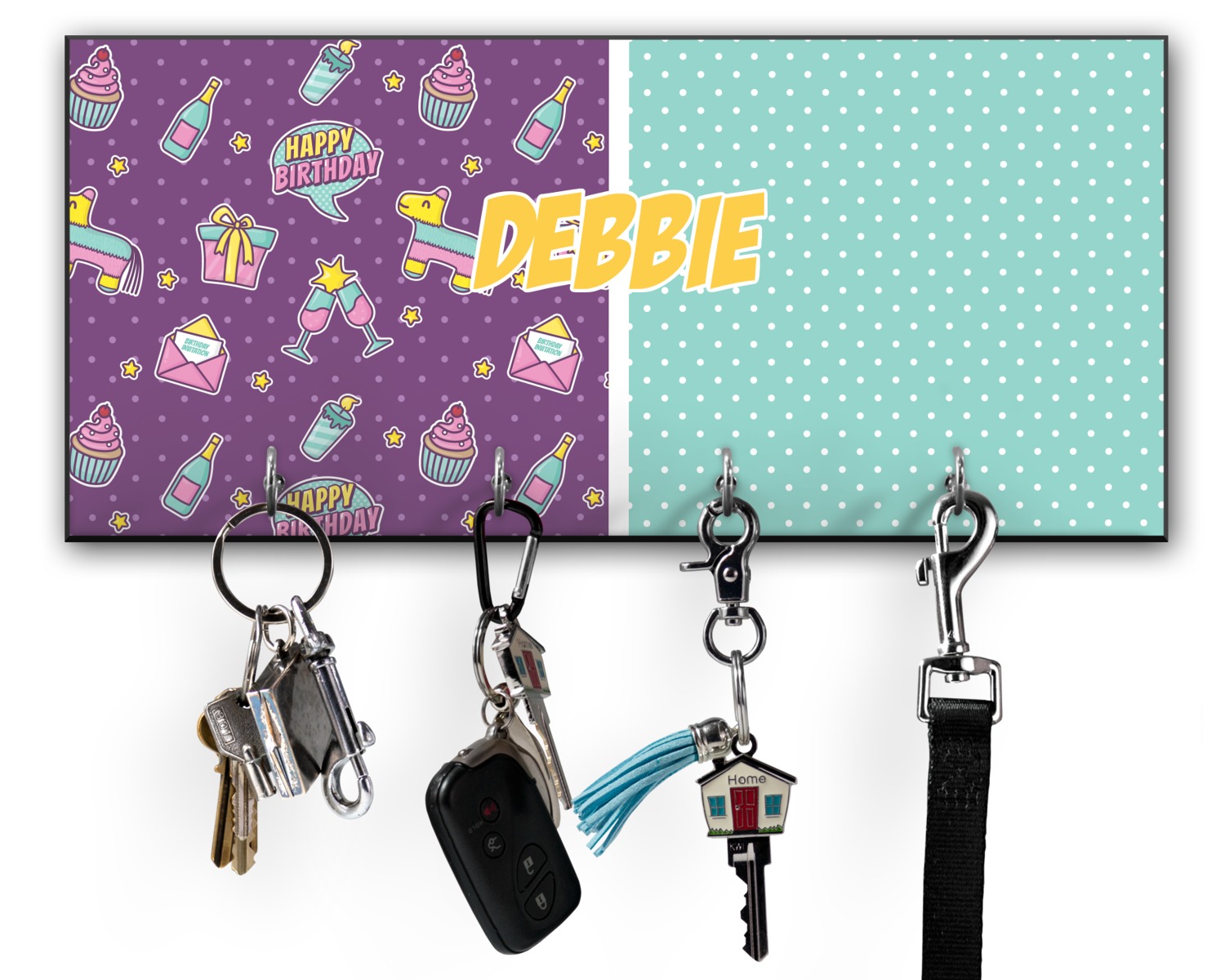 This 11" x 5" key hanger is made of sturdy wood and has four metal hooks lining the bottom. This is the perfect size for a family with several drivers. Not only can you hang keys on it though, but pet leashes and other small items. The board is black on the sides and back and is printed with the design of your choice on the front.