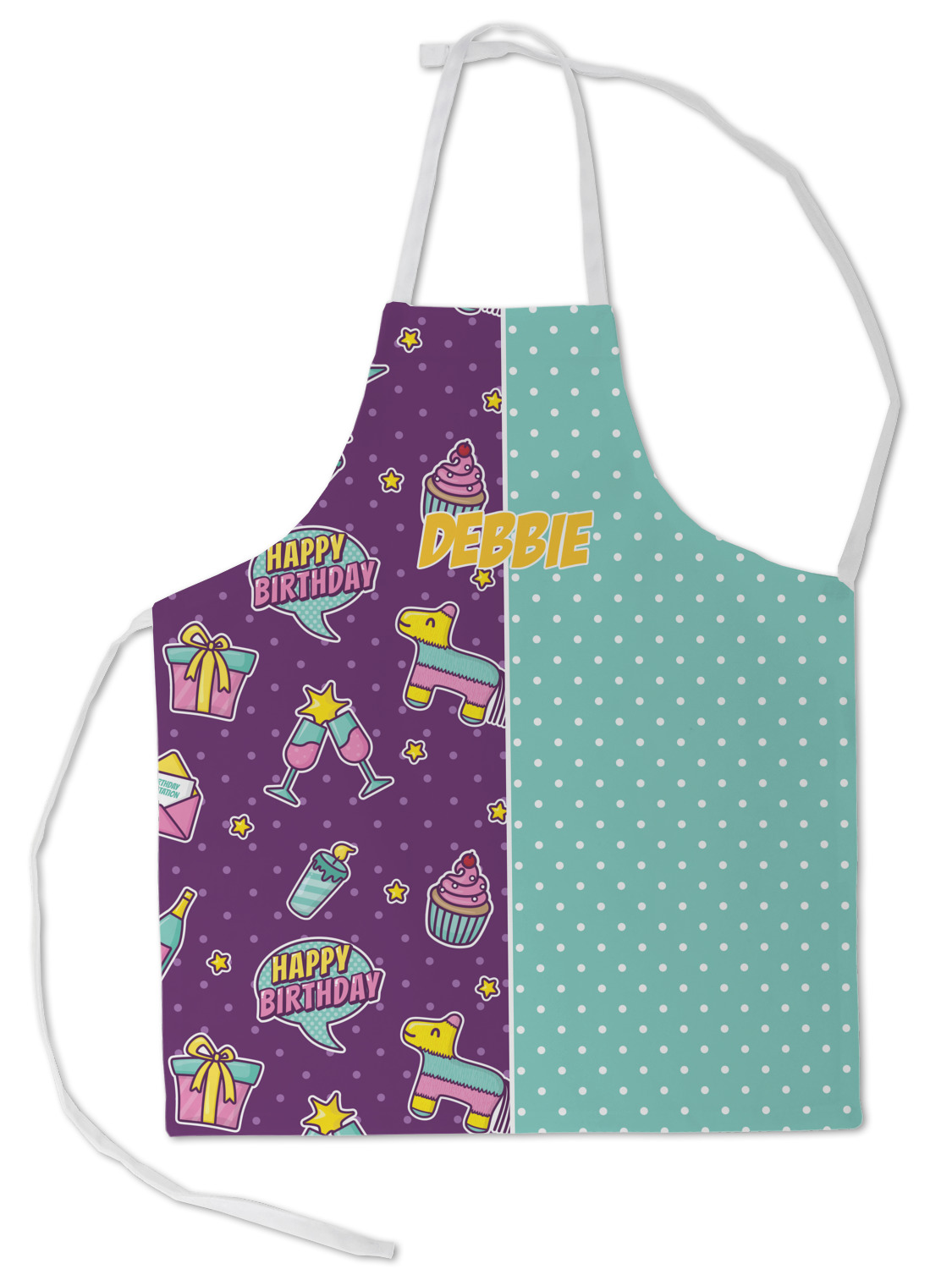 This is a two-pattern design and is split right down the middle. The left design is a bright purple with all kinds of birthday graphics including piñatas, "happy birthday" speech bubbles, presents, cupcakes and more! It also has a subtle purple polka dot pattern in the background. To compliment the polka dots, the secondary pattern is a mint green with white polka dots. Your personalization goes in the bottom right hand side, giving the design an asymmetrical feeling.