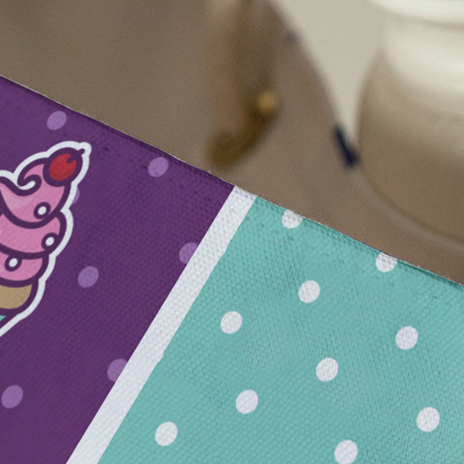 This is a two-pattern design and is split right down the middle. The left design is a bright purple with all kinds of birthday graphics including piñatas, "happy birthday" speech bubbles, presents, cupcakes and more! It also has a subtle purple polka dot pattern in the background. To compliment the polka dots, the secondary pattern is a mint green with white polka dots. Your personalization goes in the bottom right hand side, giving the design an asymmetrical feeling.