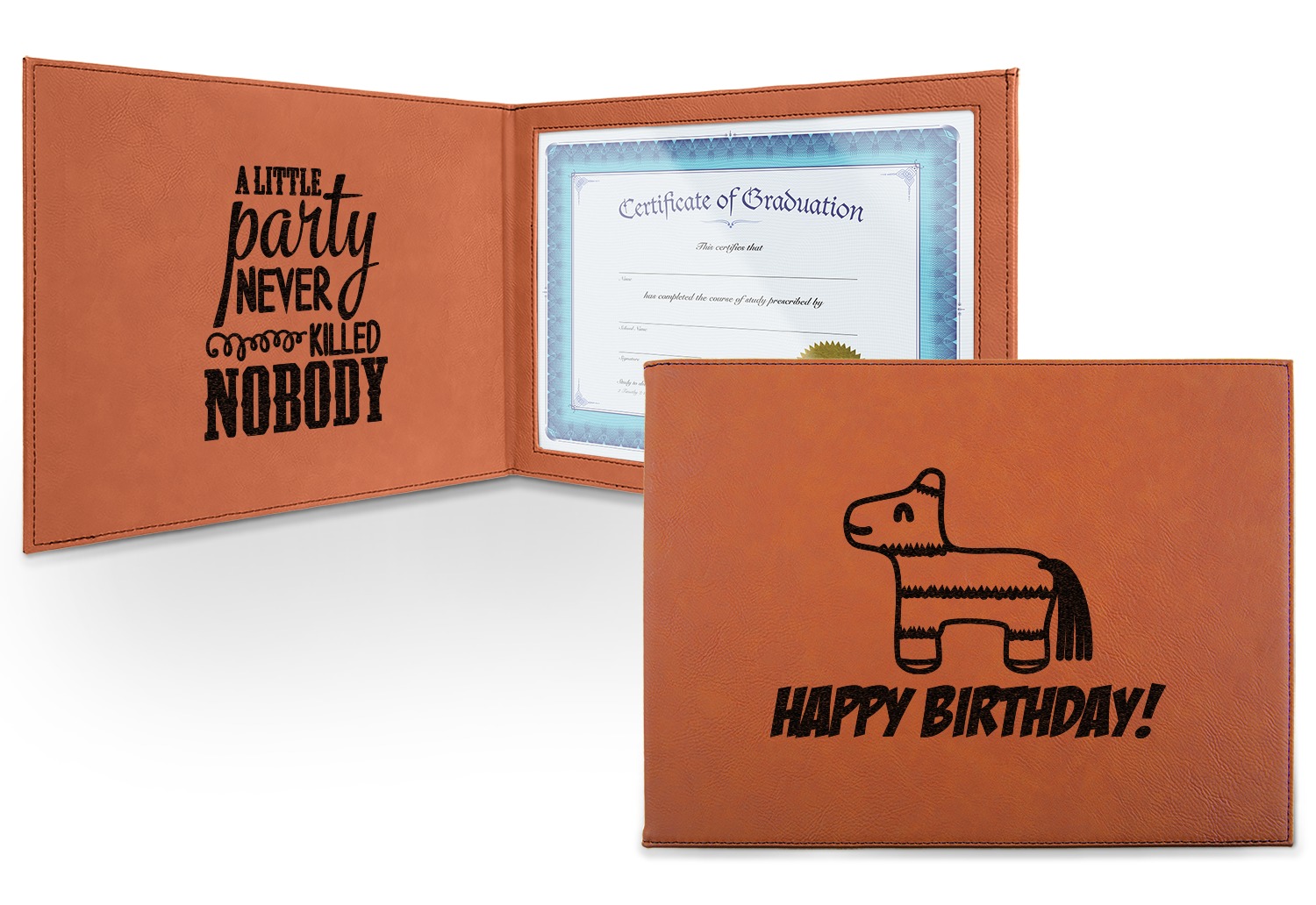 This cognac-colored, leatherette certificate jacket is the ideal way to display or store your hard-earned certificate. When closed, the custom certificate holder measures at 12 by 9 inches. The interior of the certificate cover includes a clear, vinyl window to encase your diploma. The window measures at around 10.5 by 7.5 inches and can accommodate a diploma that measures at up to 8.5 by 11 inches. You can either choose to have your customization laser engraved on the front and interior, or solely the front.