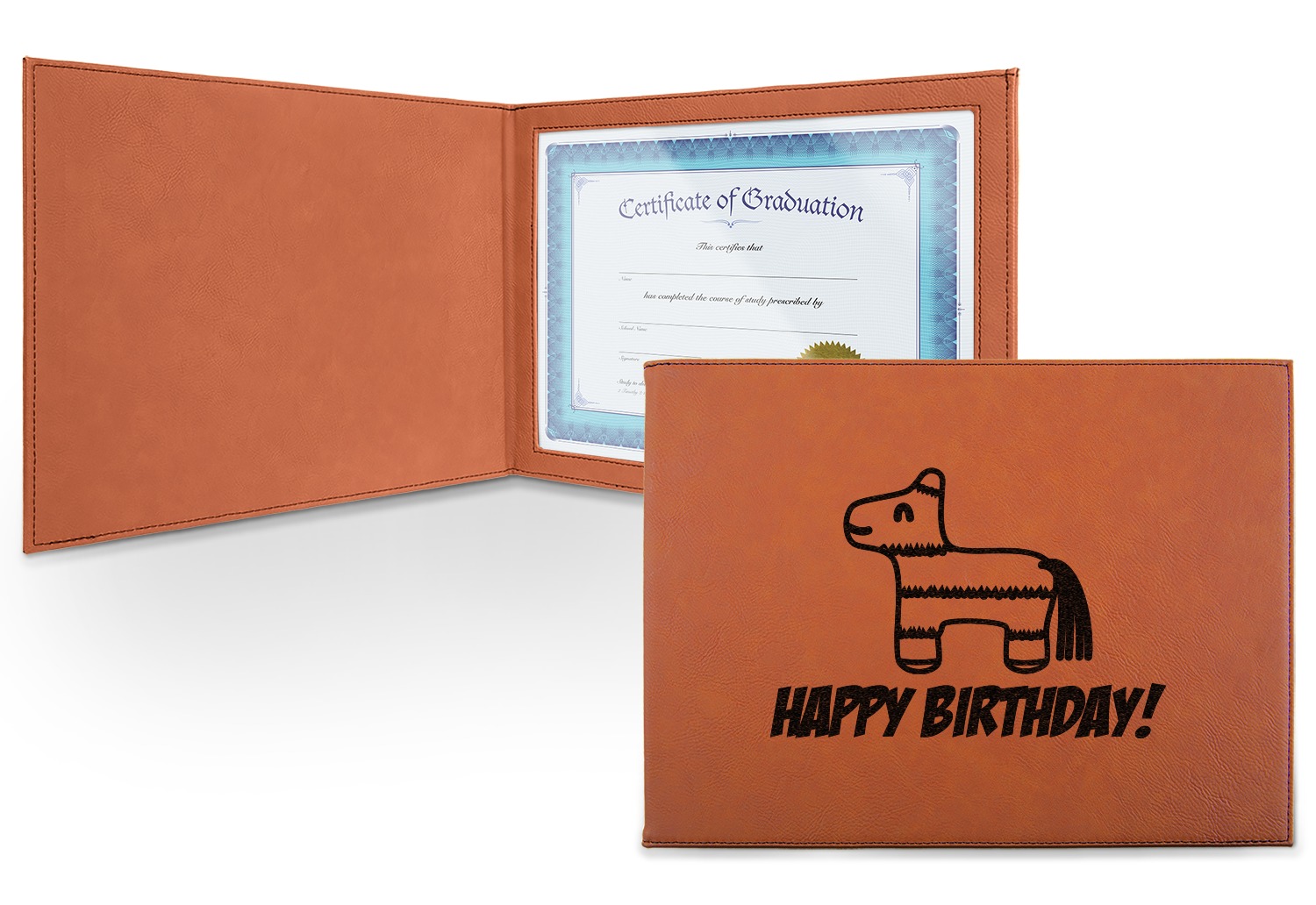 This cognac-colored, leatherette certificate jacket is the ideal way to display or store your hard-earned certificate. When closed, the custom certificate holder measures at 12 by 9 inches. The interior of the certificate cover includes a clear, vinyl window to encase your diploma. The window measures at around 10.5 by 7.5 inches and can accommodate a diploma that measures at up to 8.5 by 11 inches. You can either choose to have your customization laser engraved on the front and interior, or solely the front.