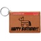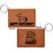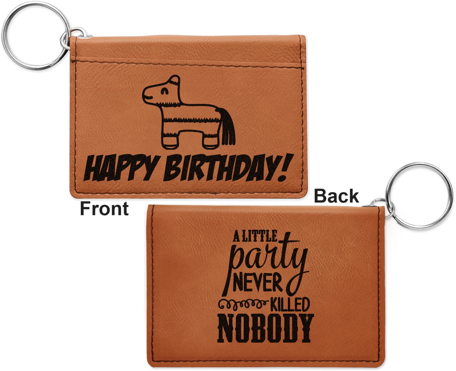 These ID wallet keychains features three pockets on the inside to accommodate your ID and your most frequently used cards. Another pocket occupies the front of the wallet's exterior, and can hold some cash or another card. The wallet is accompanied by a thick metal ring for easy attachment to a belt clip or purse. Each card holder keychain measures at 4.25 by 3 inches and is a beautiful, cognac, medium-brown shade. The personalized monogram, font, or graphic of your choosing is laser engraved into the surface of the wallet, creating a black imprint. We sell these ID wallets in two models: single sided and double sided engraving.