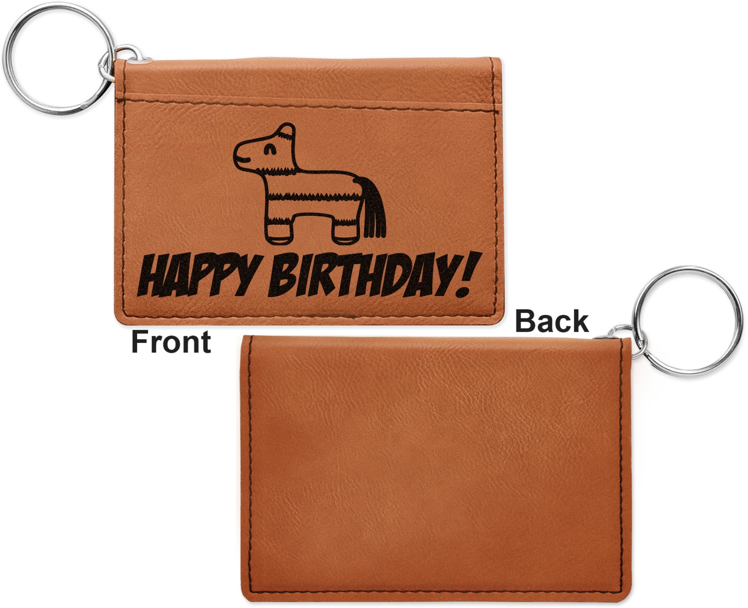 These ID wallet keychains features three pockets on the inside to accommodate your ID and your most frequently used cards. Another pocket occupies the front of the wallet's exterior, and can hold some cash or another card. The wallet is accompanied by a thick metal ring for easy attachment to a belt clip or purse. Each card holder keychain measures at 4.25 by 3 inches and is a beautiful, cognac, medium-brown shade. The personalized monogram, font, or graphic of your choosing is laser engraved into the surface of the wallet, creating a black imprint. We sell these ID wallets in two models: single sided and double sided engraving.