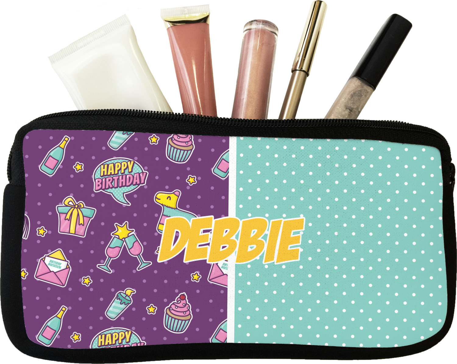 Our personalized makeup bags are available in many different designs, patterns and colors - so you are sure to find one that will love. They are made of neoprene (same material as wet-suits) and thus are water resistant, so spillages in your makeup bag will not end up all over you purse. They are customized on one side and are black on the other side and the zipper is black as well.