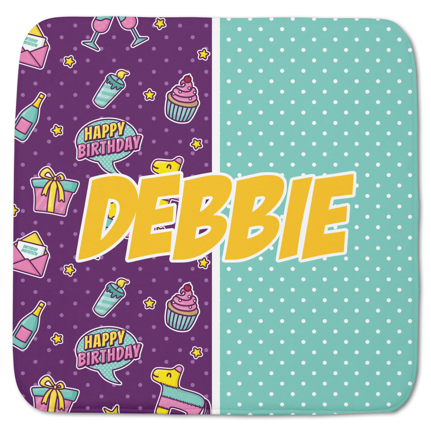 This is a two-pattern design and is split right down the middle. The left design is a bright purple with all kinds of birthday graphics including piñatas, "happy birthday" speech bubbles, presents, cupcakes and more! It also has a subtle purple polka dot pattern in the background. To compliment the polka dots, the secondary pattern is a mint green with white polka dots. Your personalization goes in the bottom right hand side, giving the design an asymmetrical feeling.