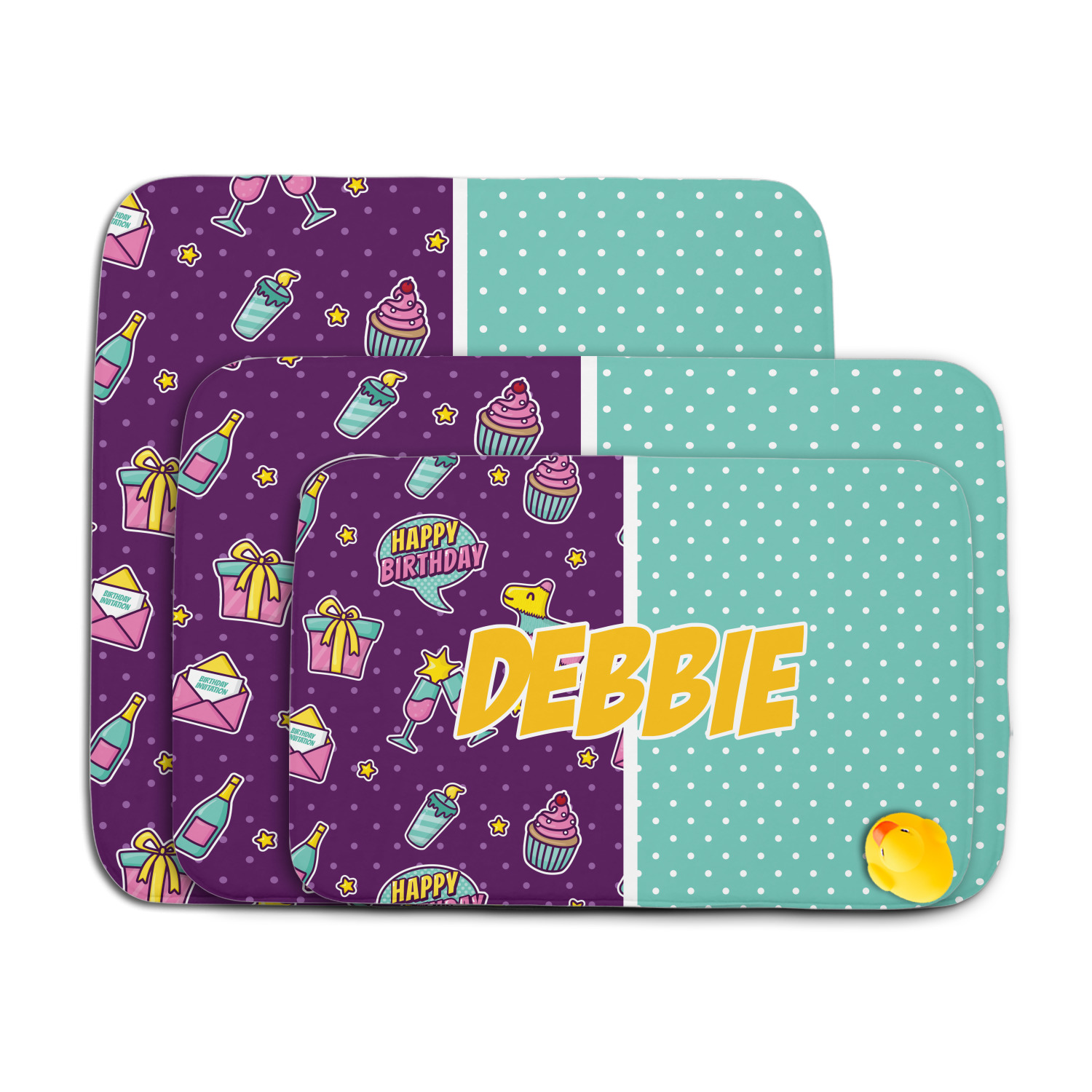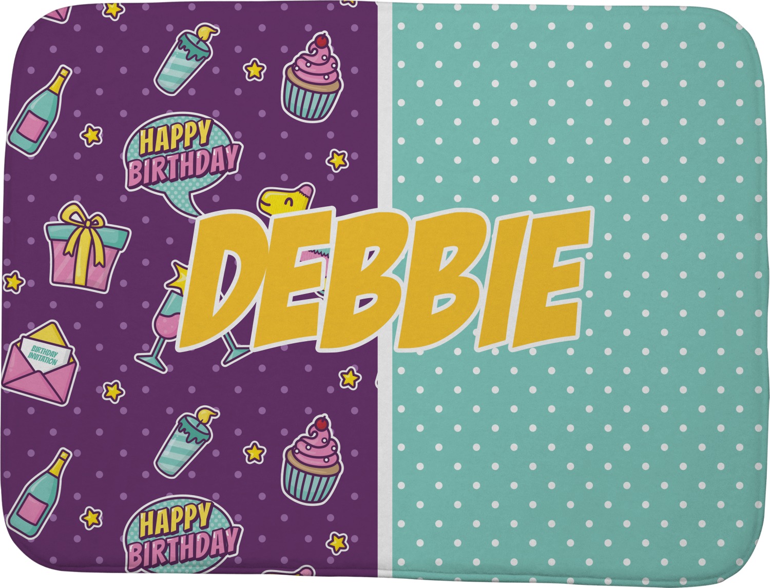 This is a two-pattern design and is split right down the middle. The left design is a bright purple with all kinds of birthday graphics including piñatas, "happy birthday" speech bubbles, presents, cupcakes and more! It also has a subtle purple polka dot pattern in the background. To compliment the polka dots, the secondary pattern is a mint green with white polka dots. Your personalization goes in the bottom right hand side, giving the design an asymmetrical feeling.