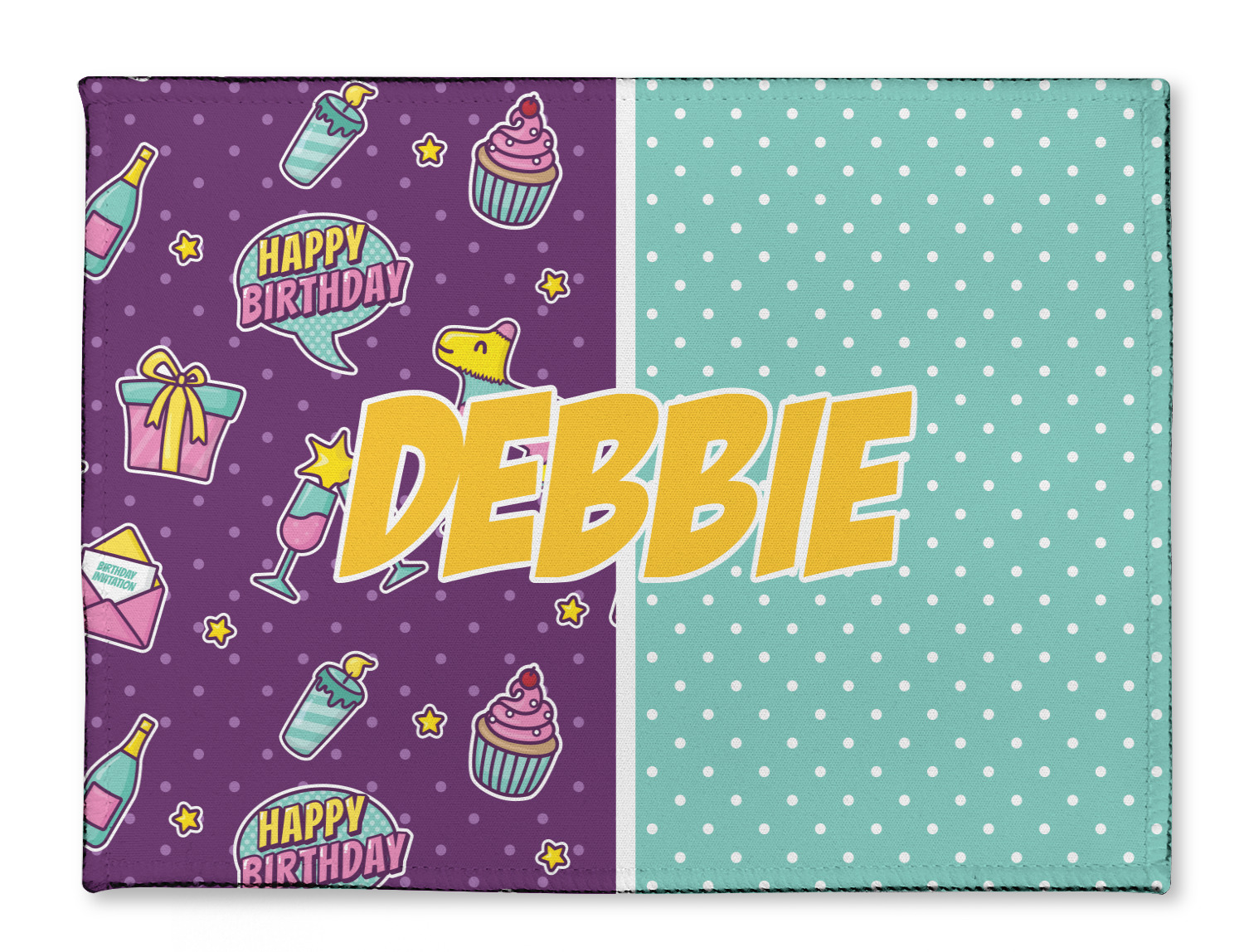 This is a two-pattern design and is split right down the middle. The left design is a bright purple with all kinds of birthday graphics including piñatas, "happy birthday" speech bubbles, presents, cupcakes and more! It also has a subtle purple polka dot pattern in the background. To compliment the polka dots, the secondary pattern is a mint green with white polka dots. Your personalization goes in the bottom right hand side, giving the design an asymmetrical feeling.