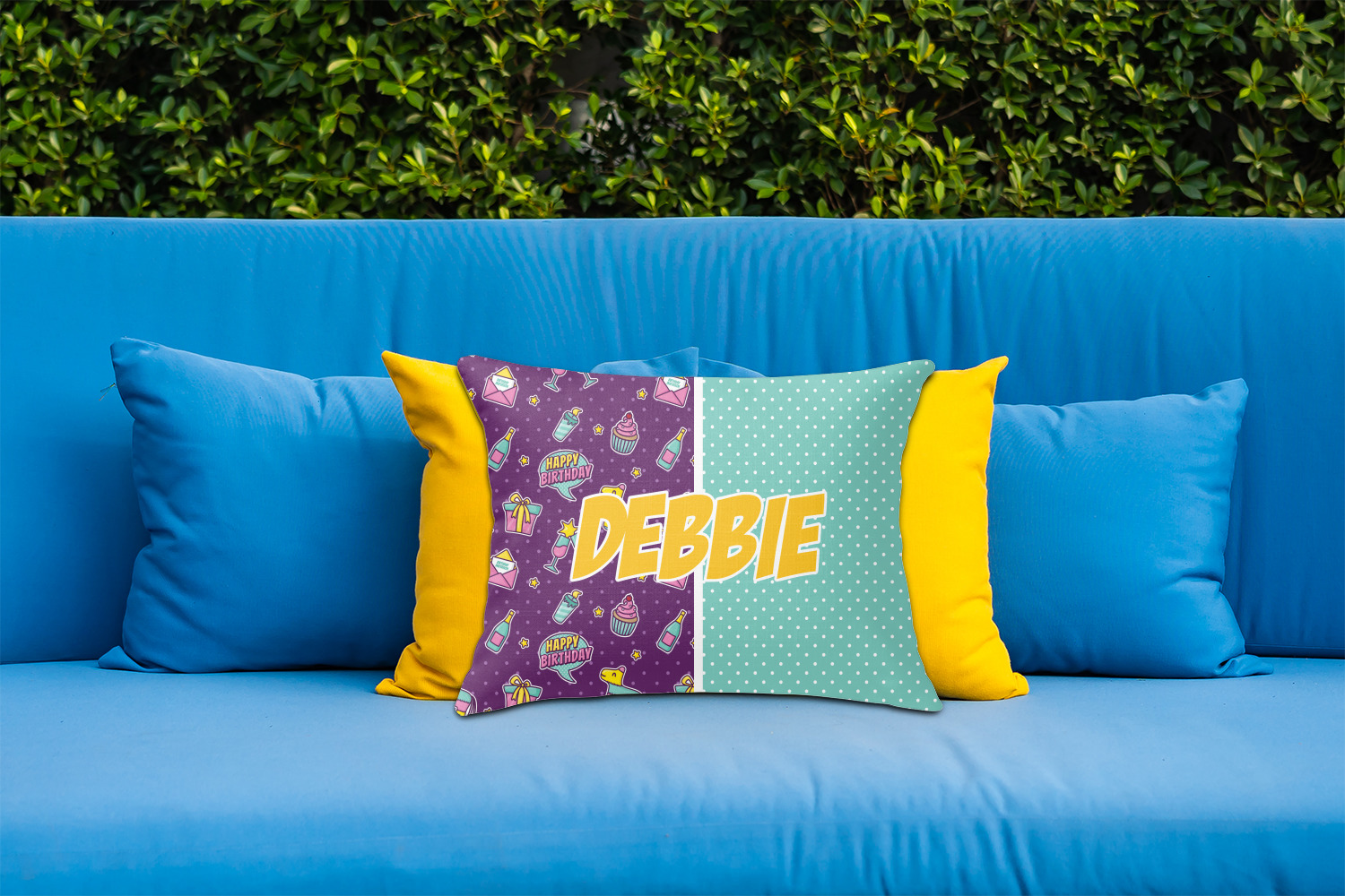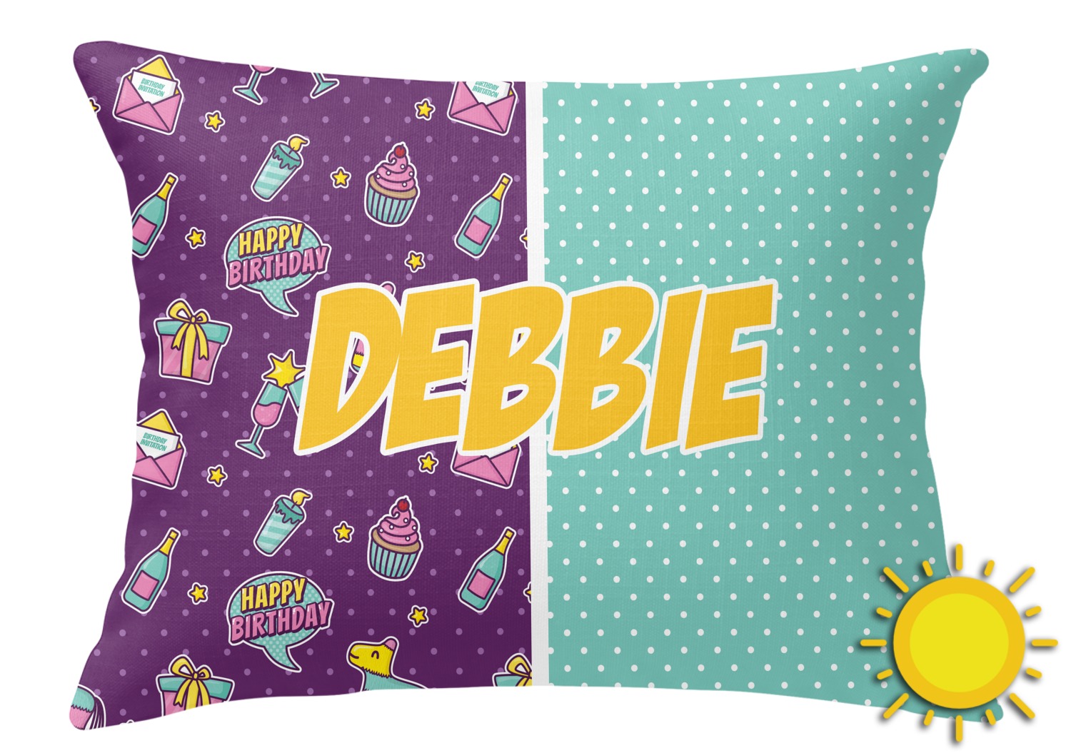 This is a two-pattern design and is split right down the middle. The left design is a bright purple with all kinds of birthday graphics including piñatas, "happy birthday" speech bubbles, presents, cupcakes and more! It also has a subtle purple polka dot pattern in the background. To compliment the polka dots, the secondary pattern is a mint green with white polka dots. Your personalization goes in the bottom right hand side, giving the design an asymmetrical feeling.