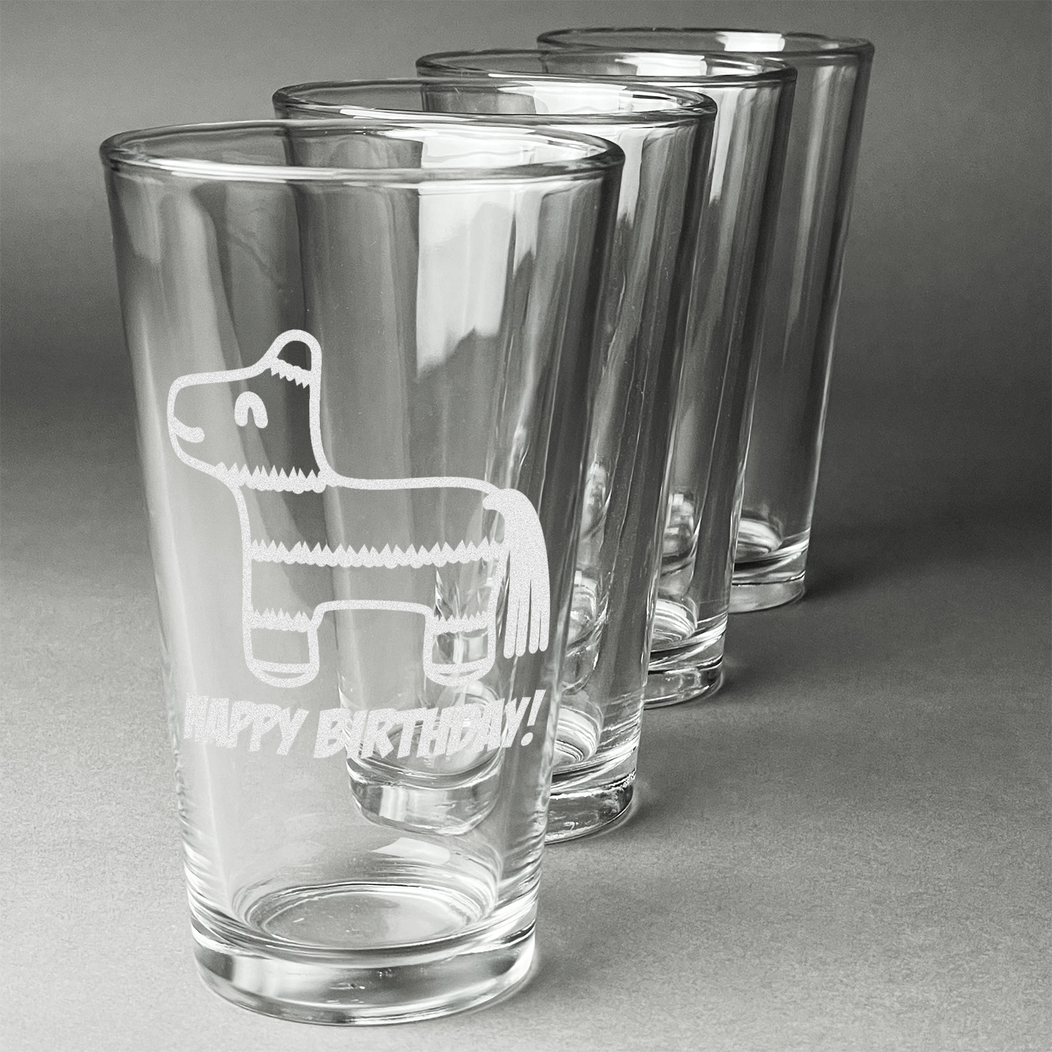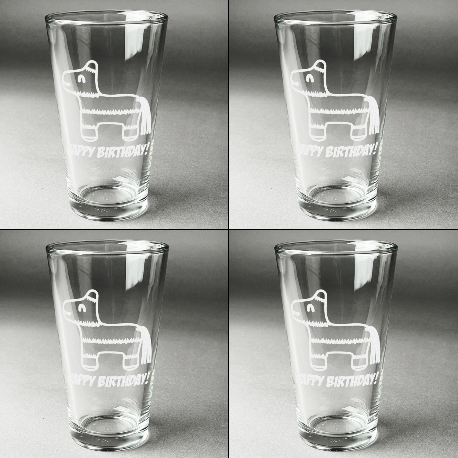 Available in a single glass or a set of 4 - each glass will be custom engraved with your design. Each glass holds 16 oz and measure 5.75"H x 3.5"W.