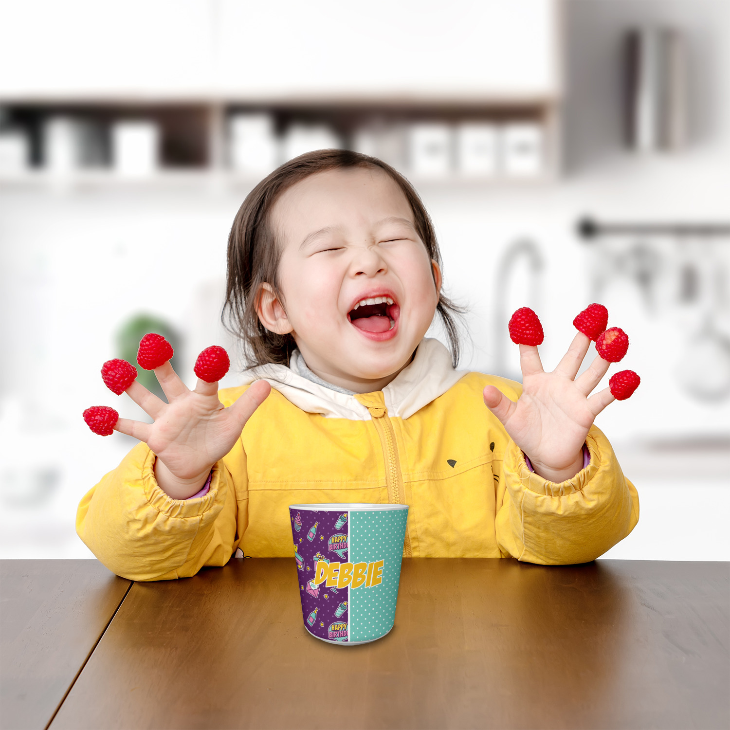 Made from a durable plastic, these tumbler cups are strong enough to withstand daily use and are perfect for young children. Each of these personalized plastic cups holds 6 ounces and measure at approximately 3" x 3" x 3.25". Place them in the bathroom as a rinsing cup, or give them to your kids during mealtimes. These 6 oz. plastic cups are BPA free, microwave and dishwasher safe, for your convenience. Your personalized design is displayed across the entire outside of this cup, while the inside is white in color to make your customization really stand out.