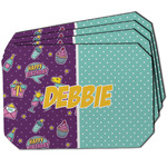 This is a two-pattern design and is split right down the middle. The left design is a bright purple with all kinds of birthday graphics including piñatas, "happy birthday" speech bubbles, presents, cupcakes and more! It also has a subtle purple polka dot pattern in the background. To compliment the polka dots, the secondary pattern is a mint green with white polka dots. Your personalization goes in the bottom right hand side, giving the design an asymmetrical feeling.