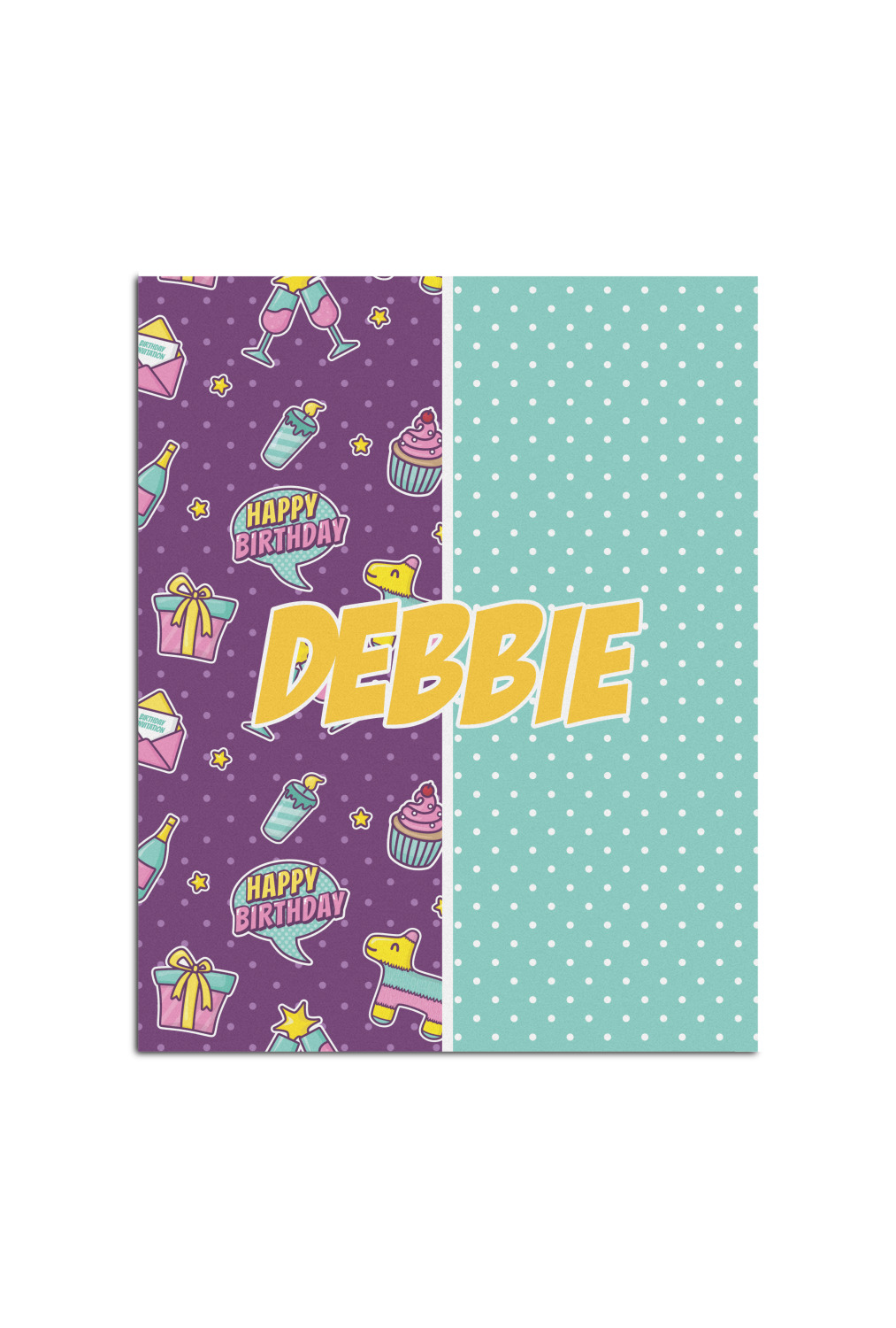 This is a two-pattern design and is split right down the middle. The left design is a bright purple with all kinds of birthday graphics including piñatas, "happy birthday" speech bubbles, presents, cupcakes and more! It also has a subtle purple polka dot pattern in the background. To compliment the polka dots, the secondary pattern is a mint green with white polka dots. Your personalization goes in the bottom right hand side, giving the design an asymmetrical feeling.