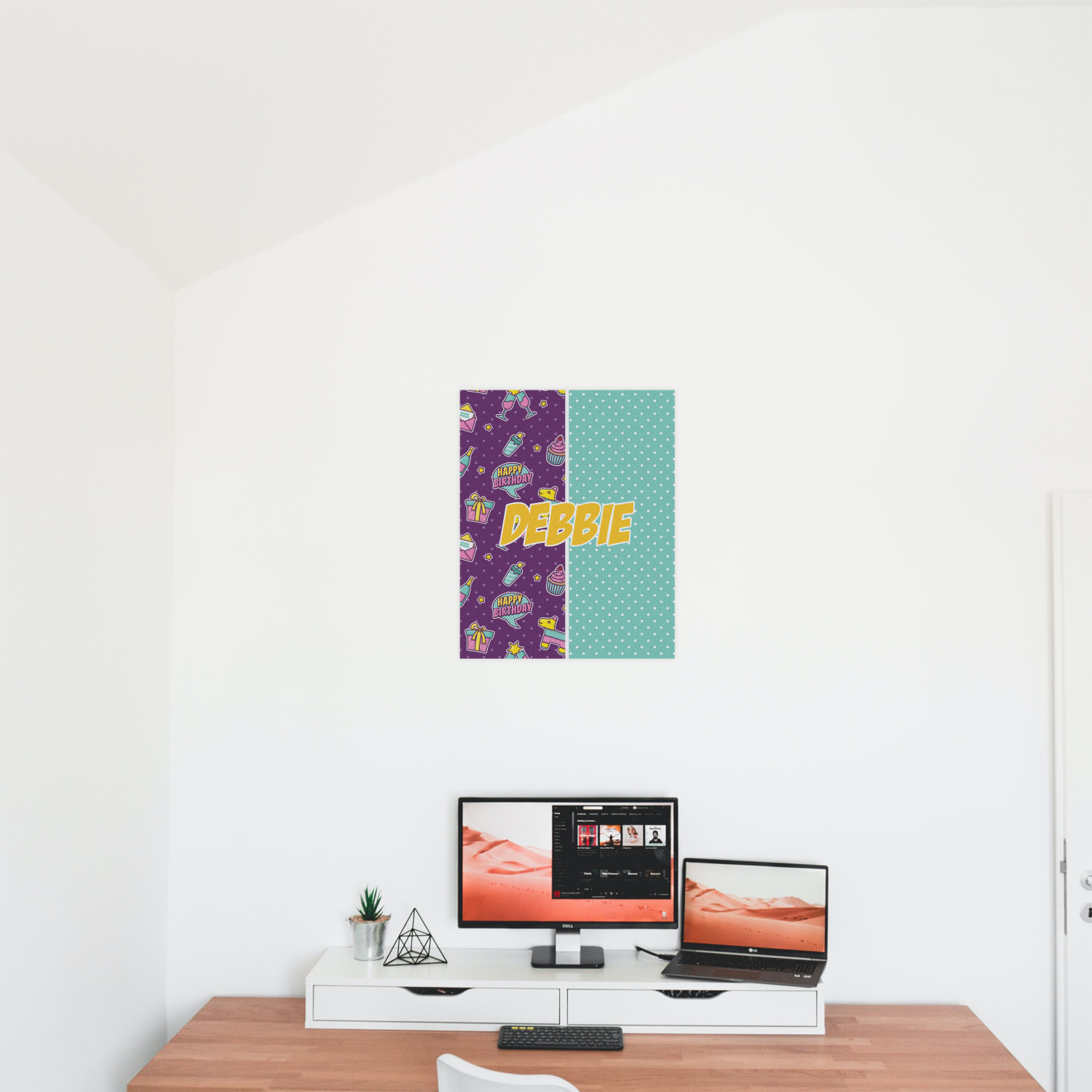 This is a two-pattern design and is split right down the middle. The left design is a bright purple with all kinds of birthday graphics including piñatas, "happy birthday" speech bubbles, presents, cupcakes and more! It also has a subtle purple polka dot pattern in the background. To compliment the polka dots, the secondary pattern is a mint green with white polka dots. Your personalization goes in the bottom right hand side, giving the design an asymmetrical feeling.