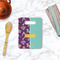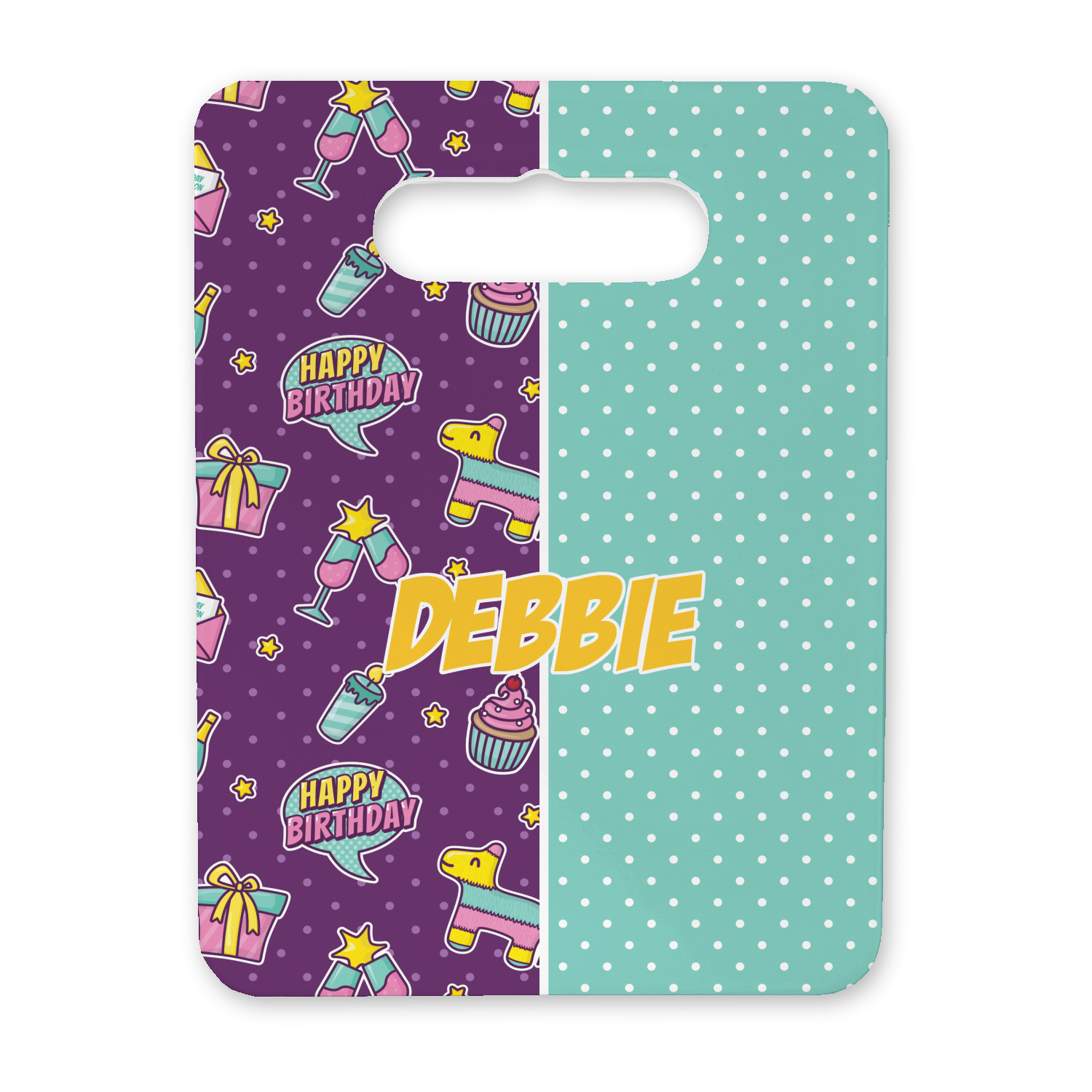 This is a two-pattern design and is split right down the middle. The left design is a bright purple with all kinds of birthday graphics including piñatas, "happy birthday" speech bubbles, presents, cupcakes and more! It also has a subtle purple polka dot pattern in the background. To compliment the polka dots, the secondary pattern is a mint green with white polka dots. Your personalization goes in the bottom right hand side, giving the design an asymmetrical feeling.