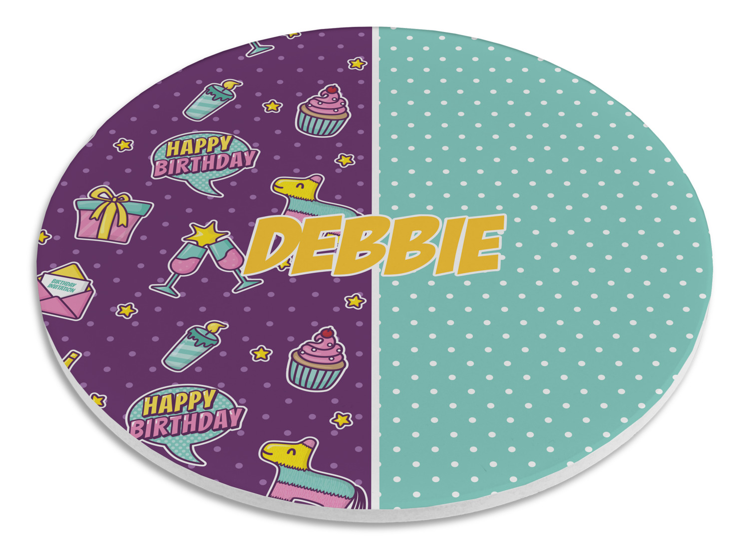 This is a two-pattern design and is split right down the middle. The left design is a bright purple with all kinds of birthday graphics including piñatas, "happy birthday" speech bubbles, presents, cupcakes and more! It also has a subtle purple polka dot pattern in the background. To compliment the polka dots, the secondary pattern is a mint green with white polka dots. Your personalization goes in the bottom right hand side, giving the design an asymmetrical feeling.