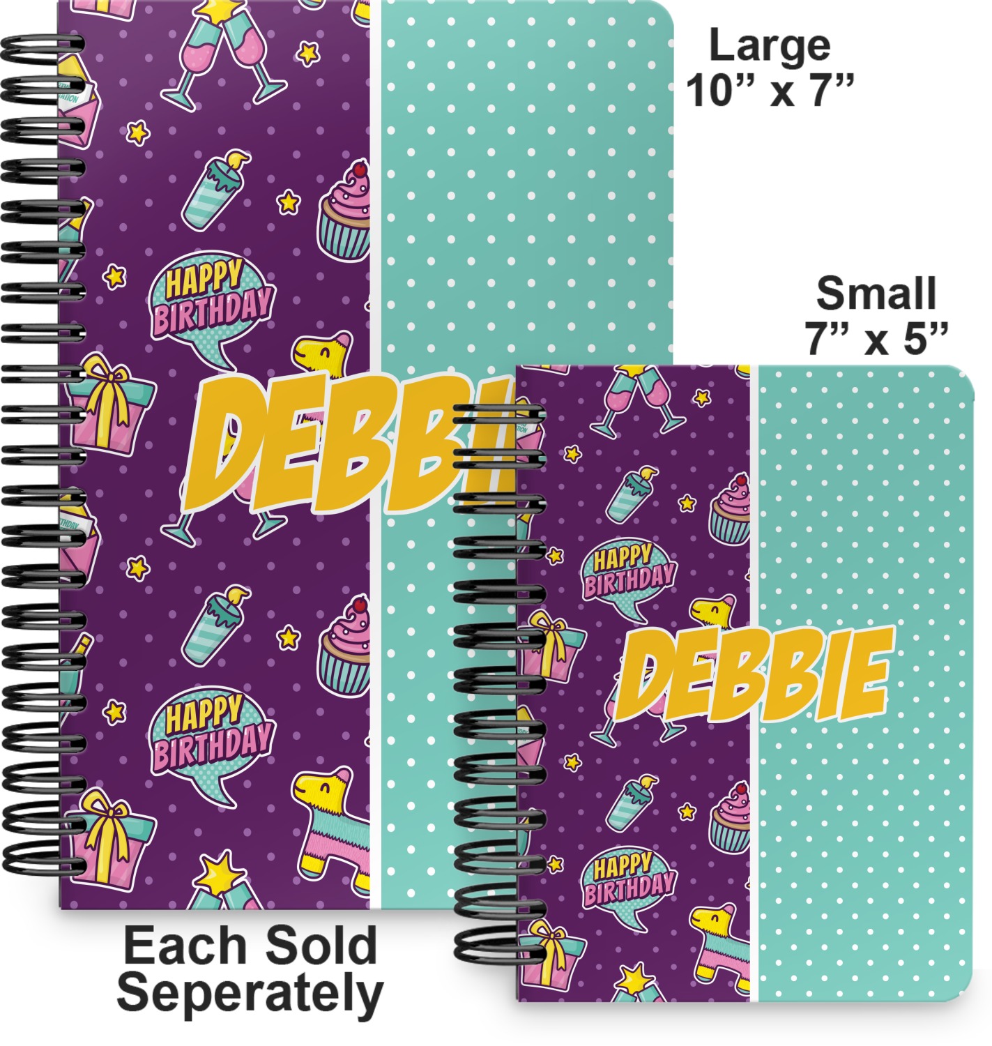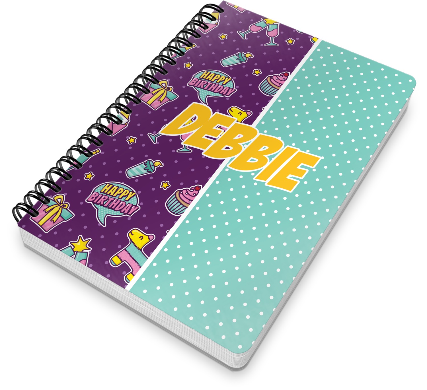 This spiral notebook includes 75 sheets of thick, ruled paper. The front and back of this custom notebook is made of a robust, laminate, plastic covering. We print your personalization on these two panels, underneath a glossy finish, which emphasizes the colors of your design. The two panels and the sheets of paper are held together by a sturdy, black coil. The paper within your bound notebook is perforated for easy, clean tearing.