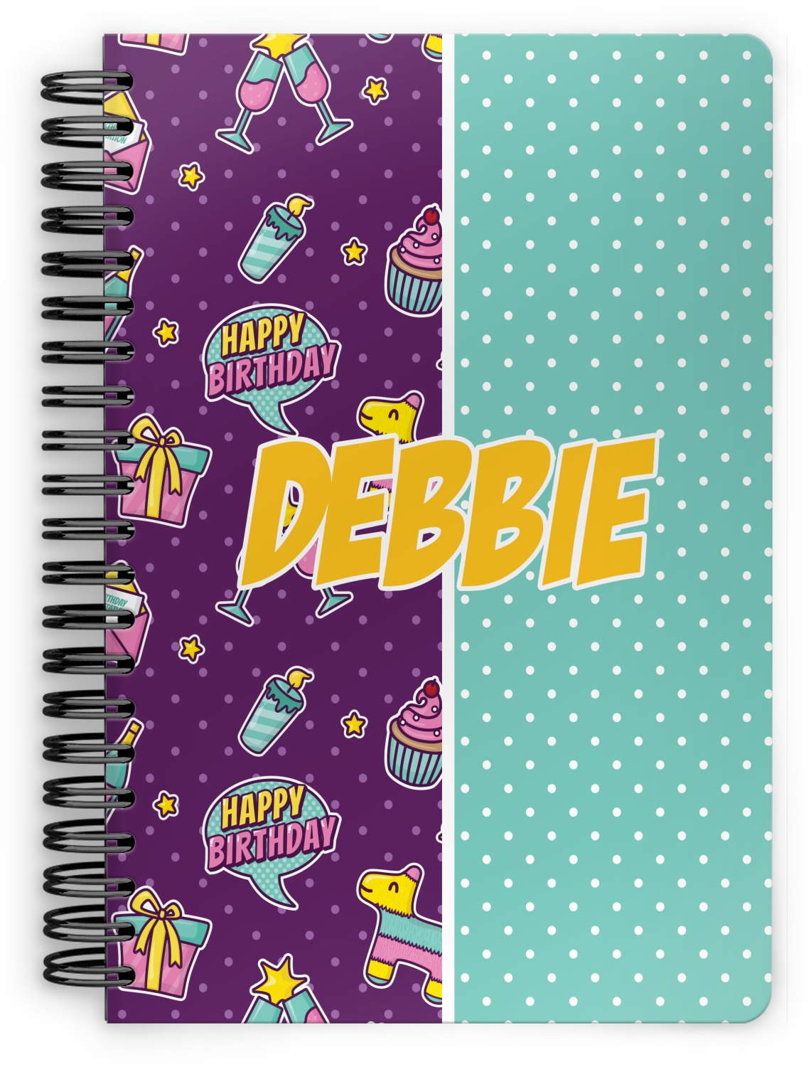 This is a two-pattern design and is split right down the middle. The left design is a bright purple with all kinds of birthday graphics including piñatas, "happy birthday" speech bubbles, presents, cupcakes and more! It also has a subtle purple polka dot pattern in the background. To compliment the polka dots, the secondary pattern is a mint green with white polka dots. Your personalization goes in the bottom right hand side, giving the design an asymmetrical feeling.
