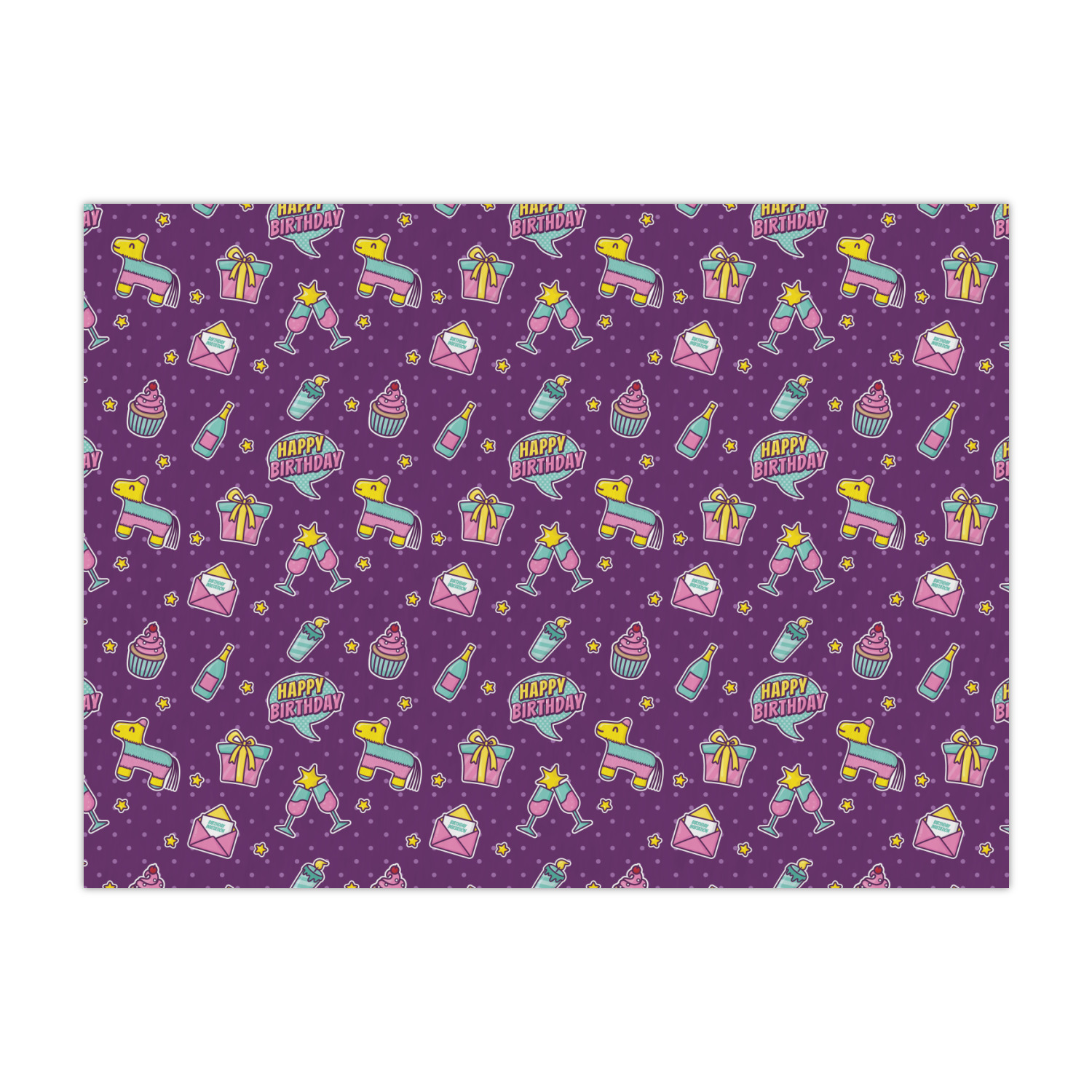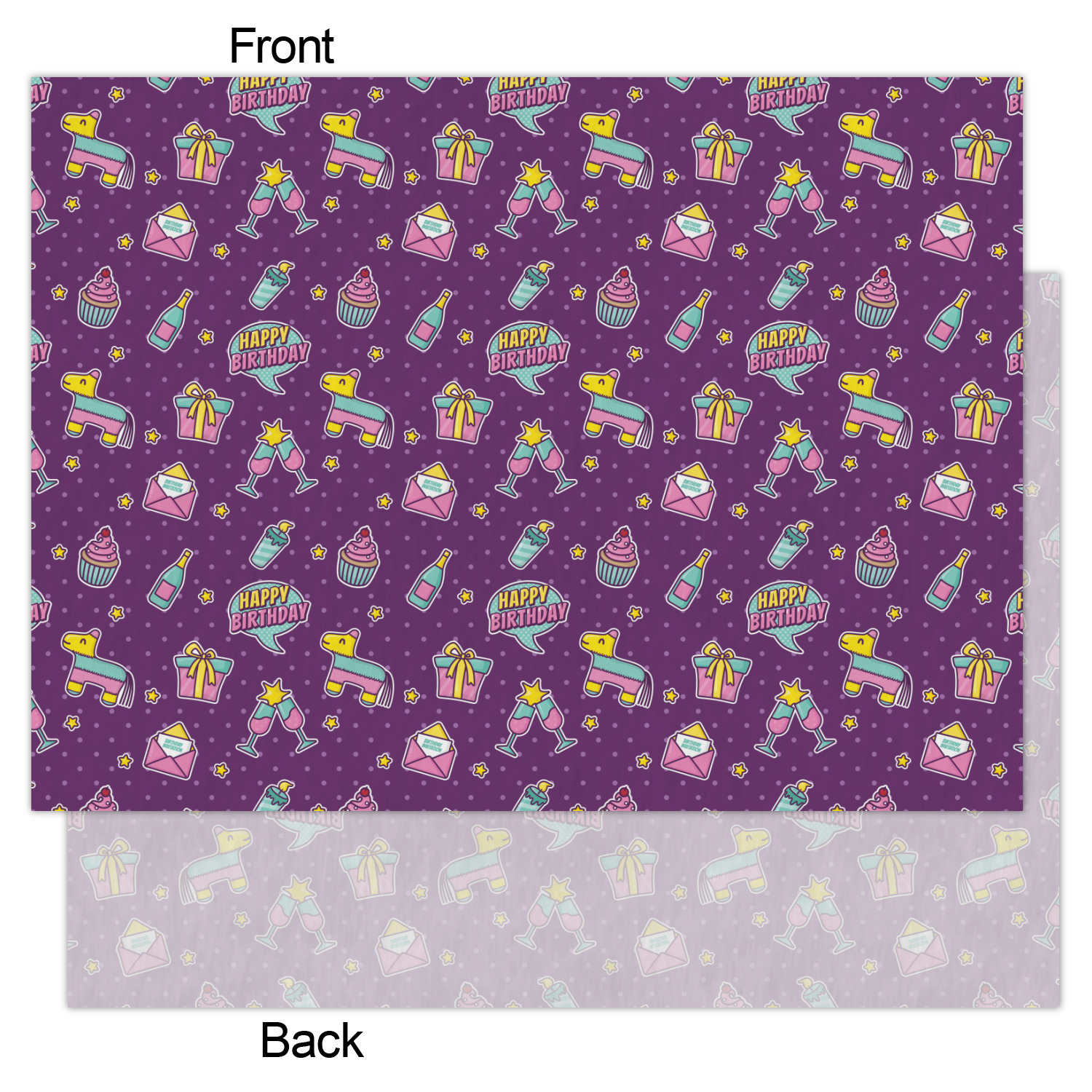 This is a two-pattern design and is split right down the middle. The left design is a bright purple with all kinds of birthday graphics including piñatas, "happy birthday" speech bubbles, presents, cupcakes and more! It also has a subtle purple polka dot pattern in the background. To compliment the polka dots, the secondary pattern is a mint green with white polka dots. Your personalization goes in the bottom right hand side, giving the design an asymmetrical feeling.