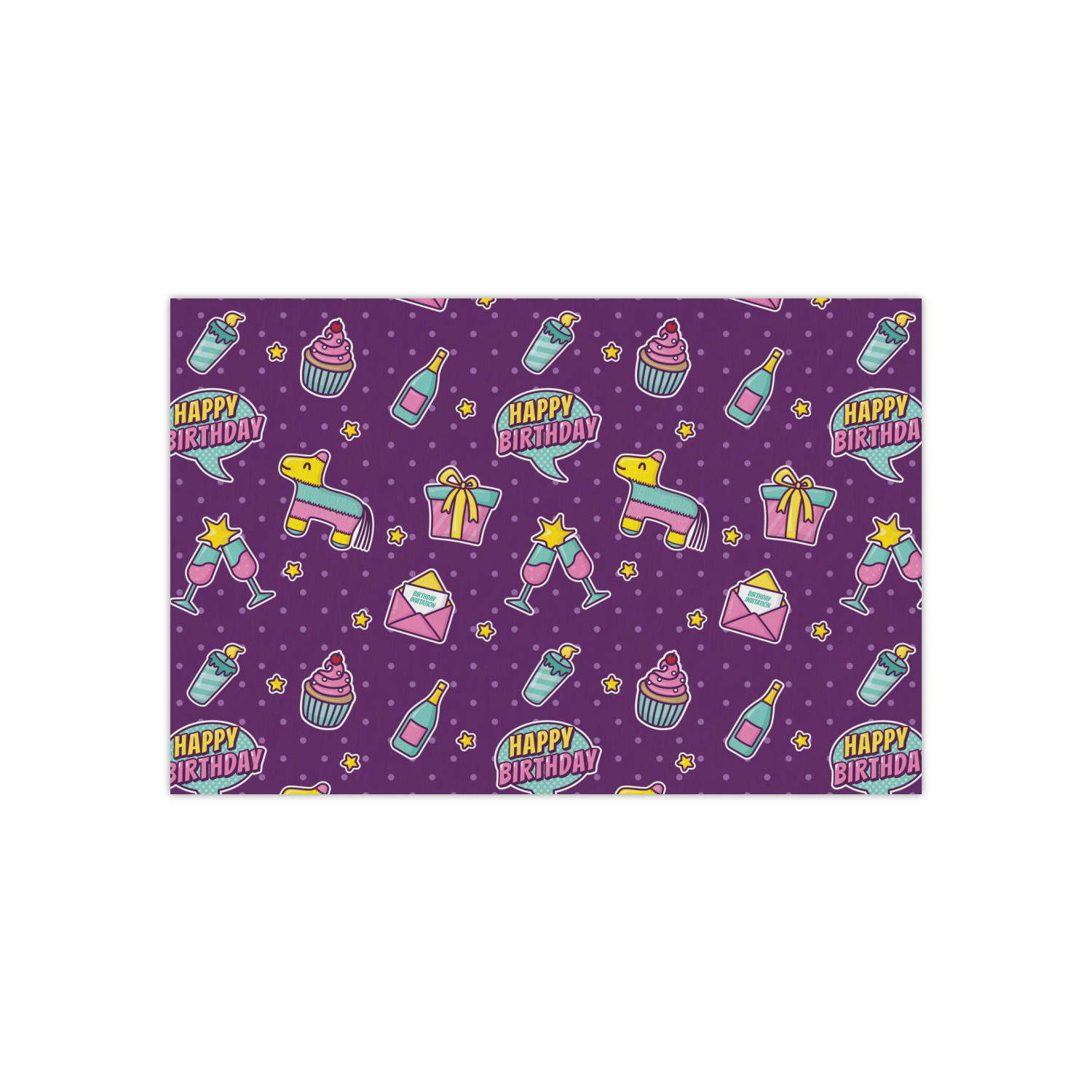 This is a two-pattern design and is split right down the middle. The left design is a bright purple with all kinds of birthday graphics including piñatas, "happy birthday" speech bubbles, presents, cupcakes and more! It also has a subtle purple polka dot pattern in the background. To compliment the polka dots, the secondary pattern is a mint green with white polka dots. Your personalization goes in the bottom right hand side, giving the design an asymmetrical feeling.