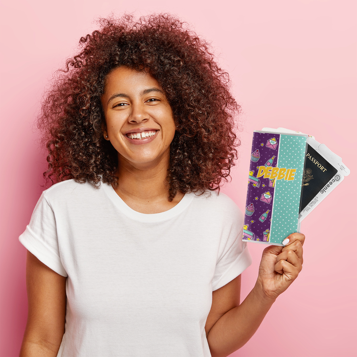 This document holder is really sturdy and has your personalized design inserted right behind all of your nifty pockets, so you can see it on the front and back covers. There are two large pockets and two shorter pockets inside. The larger pockets are tall enough to keep your boarding pass nice and straight. The smaller pockets (on top of the large pockets) are large enough to fit your passport, credit card, or ID.