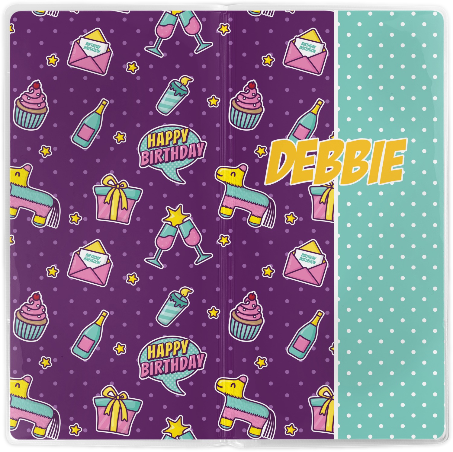 This is a two-pattern design and is split right down the middle. The left design is a bright purple with all kinds of birthday graphics including piñatas, "happy birthday" speech bubbles, presents, cupcakes and more! It also has a subtle purple polka dot pattern in the background. To compliment the polka dots, the secondary pattern is a mint green with white polka dots. Your personalization goes in the bottom right hand side, giving the design an asymmetrical feeling.