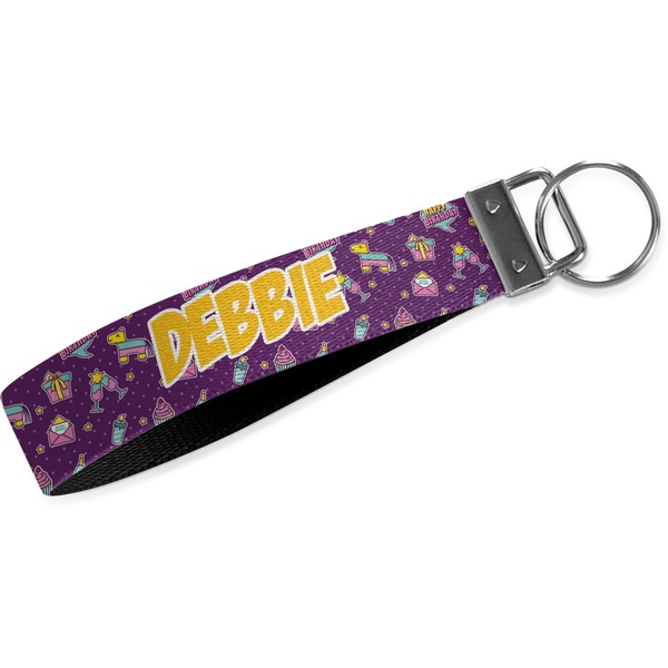 These key fob keychains are made from a polyester weave, right here in the USA. They feature a silver, metal clasp, attached to a round keyring. The piece gives the personalized wristlet a beautiful, finished look. Your customized design is printed on the outside of the keychain strap. We carry these wristlets in two sizes: small, which is 5 inches in width, and large, which is 5.5 inches in width.