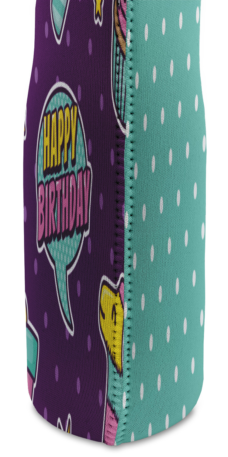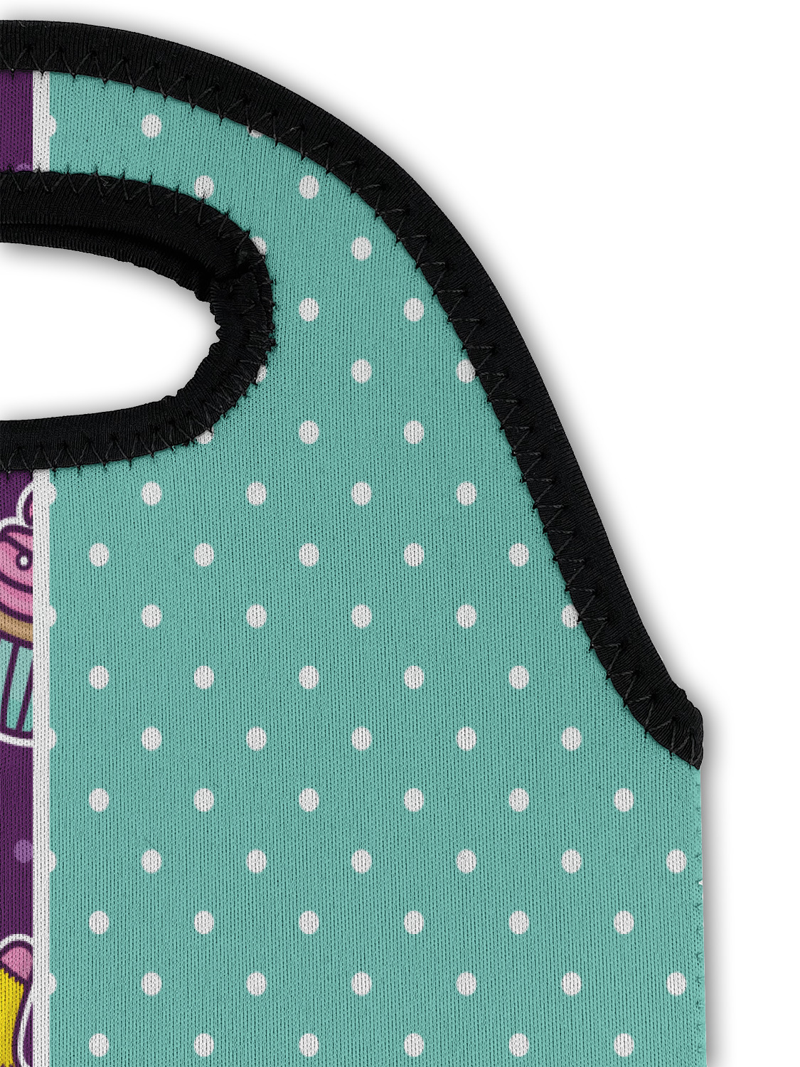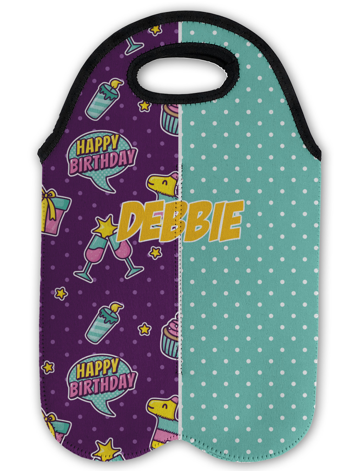 This is a two-pattern design and is split right down the middle. The left design is a bright purple with all kinds of birthday graphics including piñatas, "happy birthday" speech bubbles, presents, cupcakes and more! It also has a subtle purple polka dot pattern in the background. To compliment the polka dots, the secondary pattern is a mint green with white polka dots. Your personalization goes in the bottom right hand side, giving the design an asymmetrical feeling.