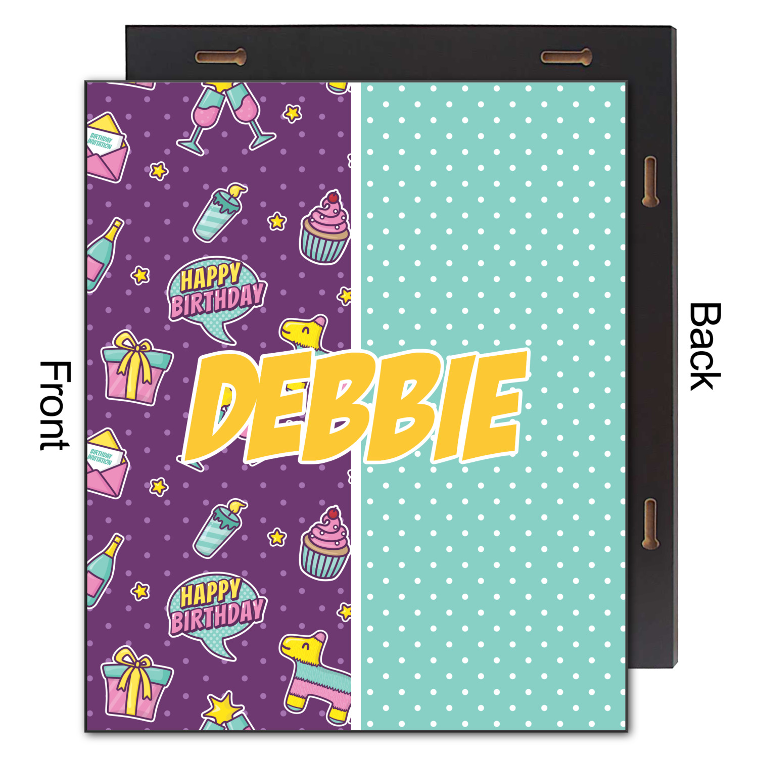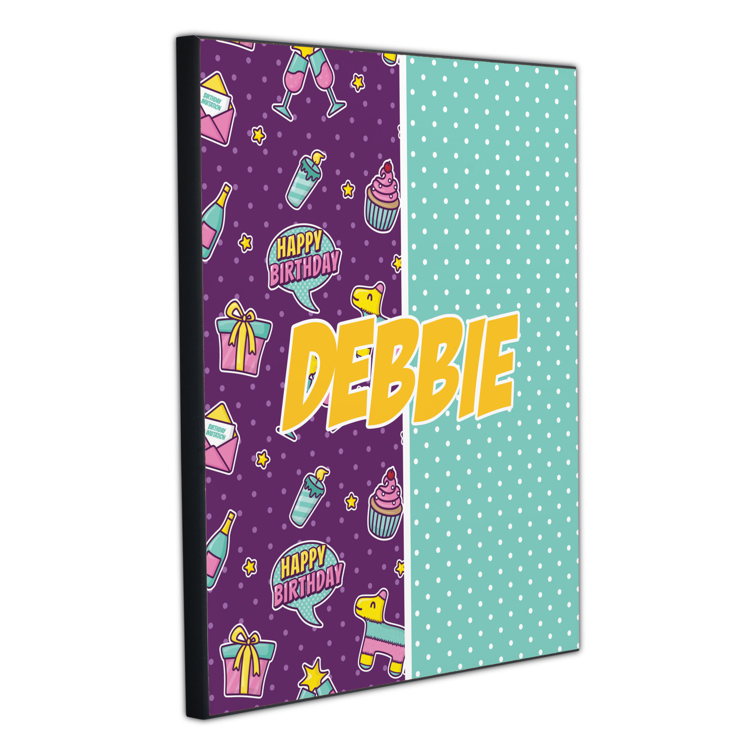 This is a two-pattern design and is split right down the middle. The left design is a bright purple with all kinds of birthday graphics including piñatas, "happy birthday" speech bubbles, presents, cupcakes and more! It also has a subtle purple polka dot pattern in the background. To compliment the polka dots, the secondary pattern is a mint green with white polka dots. Your personalization goes in the bottom right hand side, giving the design an asymmetrical feeling.