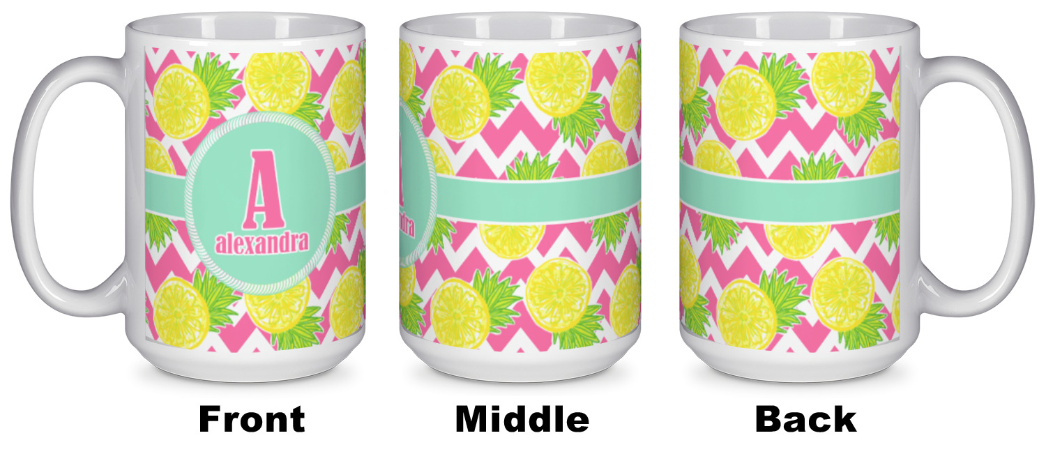 The main design has a background with bright pink and white chevron with some crazy yellow and lime pineapple slices scattered on top. A soft mint color is used for the ribbon and label, while a pink is used for the personalized name and initial.