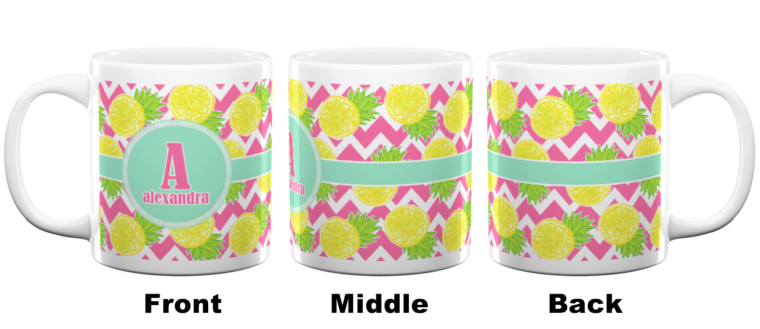The main design has a background with bright pink and white chevron with some crazy yellow and lime pineapple slices scattered on top. A soft mint color is used for the ribbon and label, while a pink is used for the personalized name and initial.