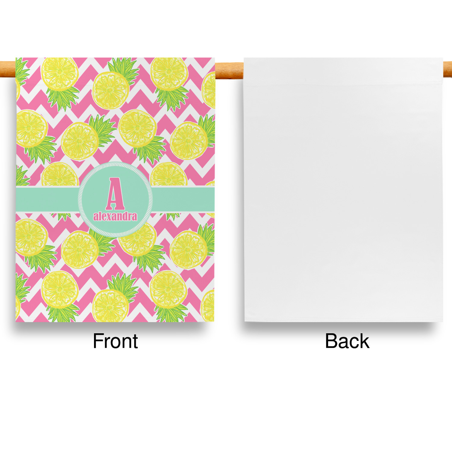 The main design has a background with bright pink and white chevron with some crazy yellow and lime pineapple slices scattered on top. A soft mint color is used for the ribbon and label, while a pink is used for the personalized name and initial.