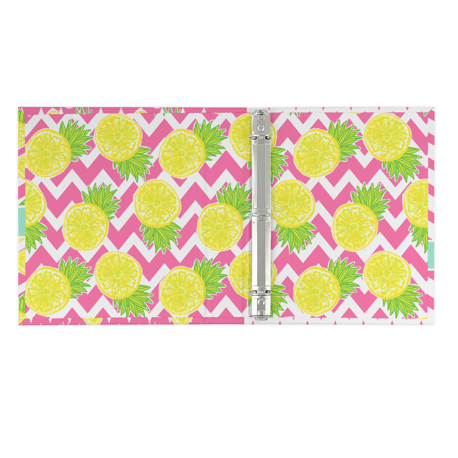 The main design has a background with bright pink and white chevron with some crazy yellow and lime pineapple slices scattered on top. A soft mint color is used for the ribbon and label, while a pink is used for the personalized name and initial.