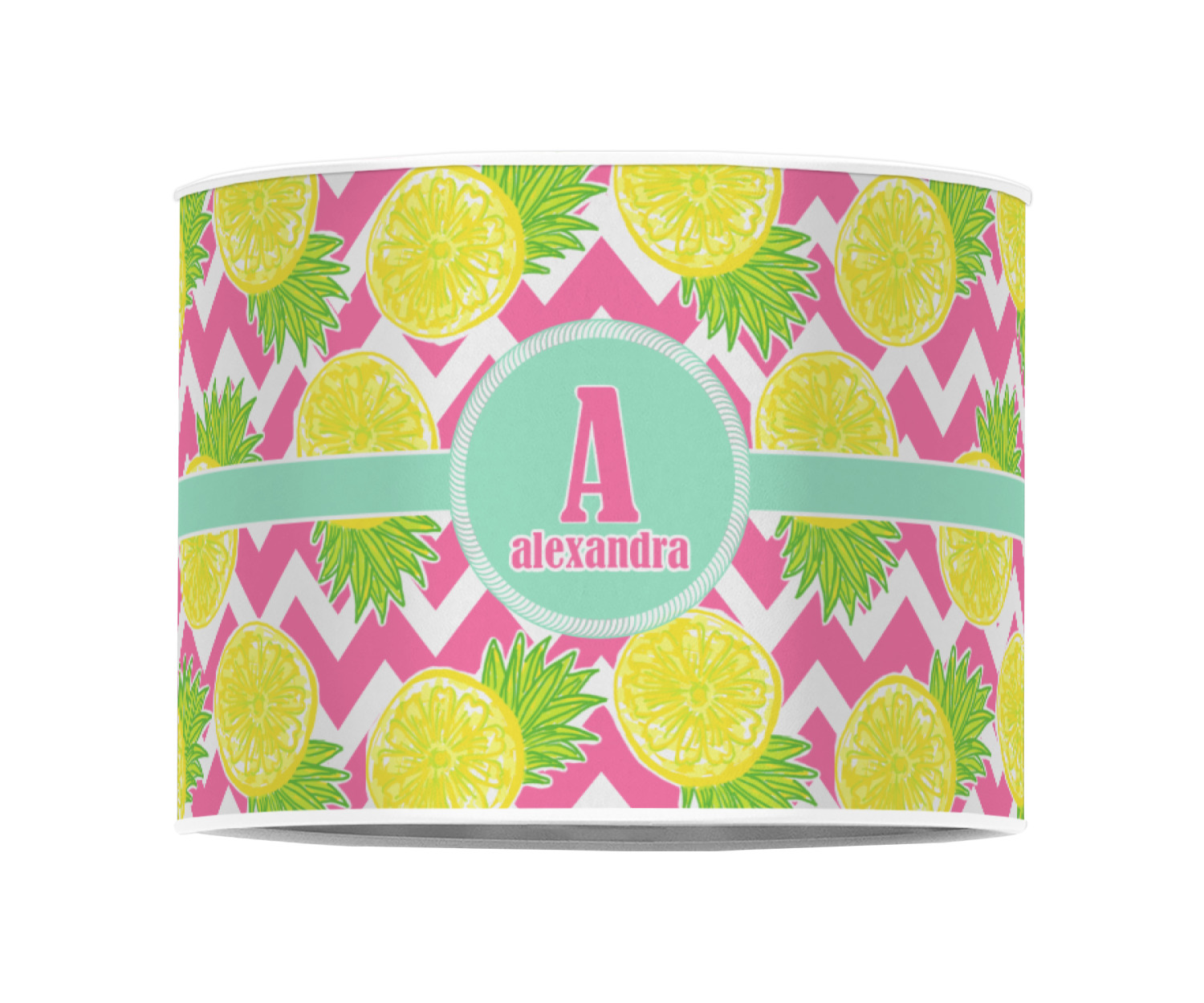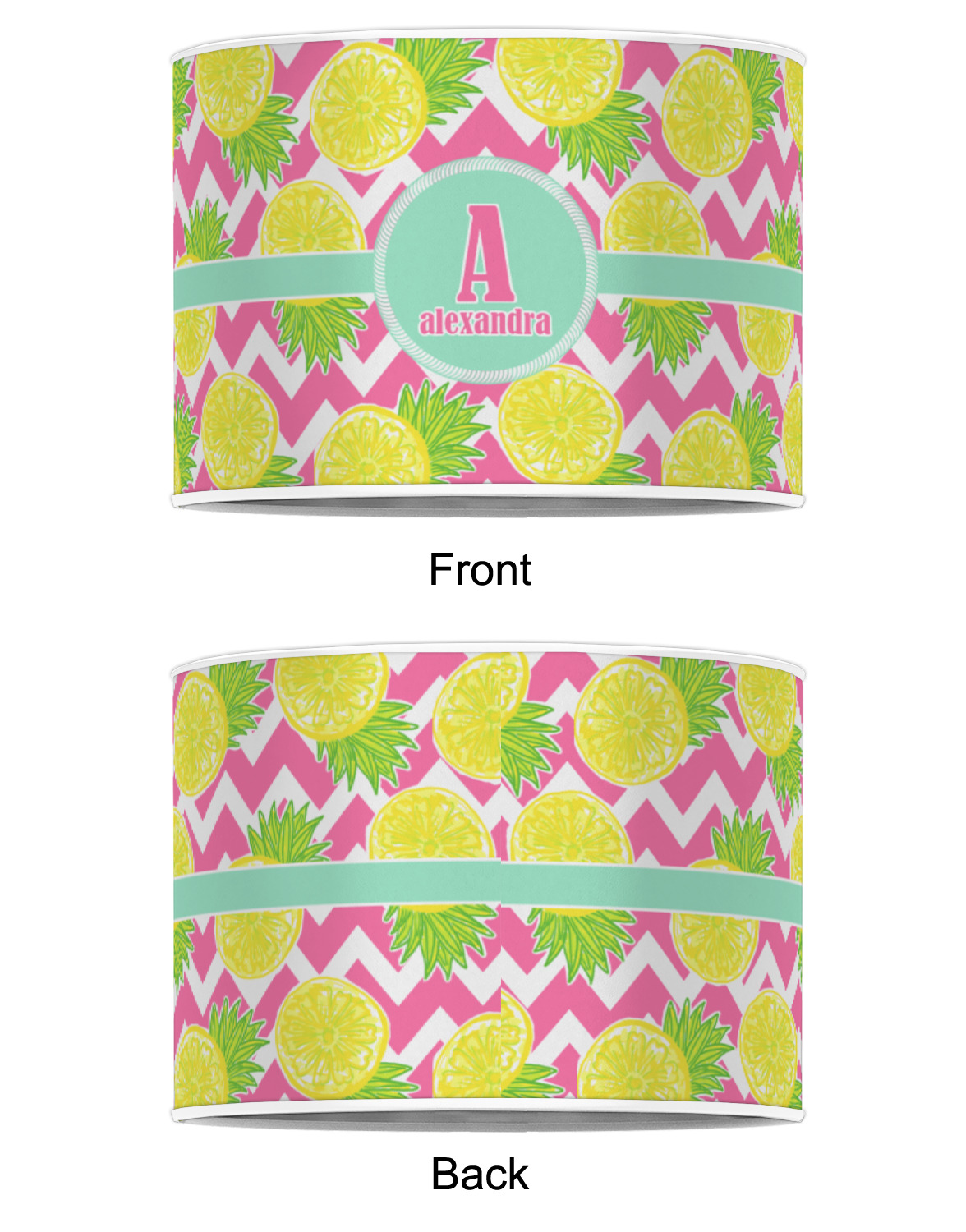 The main design has a background with bright pink and white chevron with some crazy yellow and lime pineapple slices scattered on top. A soft mint color is used for the ribbon and label, while a pink is used for the personalized name and initial.