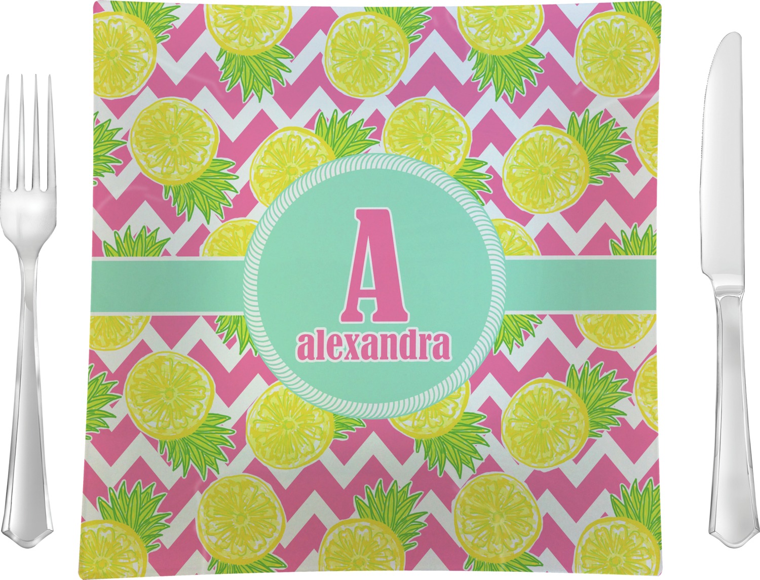 The main design has a background with bright pink and white chevron with some crazy yellow and lime pineapple slices scattered on top. A soft mint color is used for the ribbon and label, while a pink is used for the personalized name and initial.