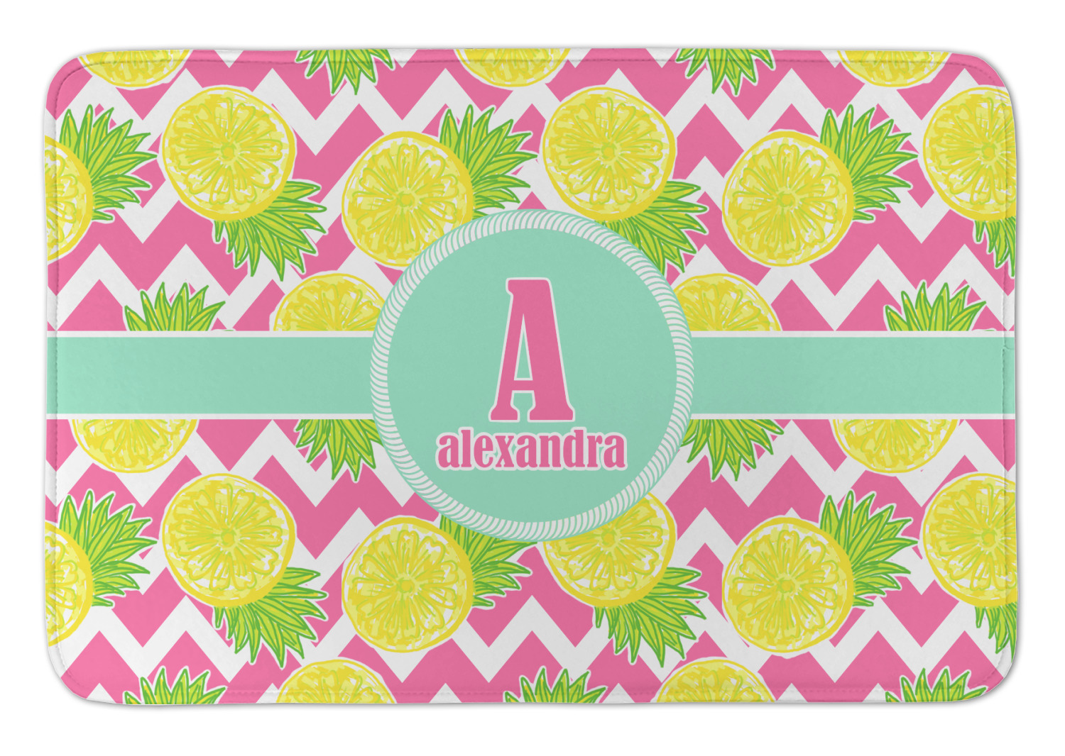 The main design has a background with bright pink and white chevron with some crazy yellow and lime pineapple slices scattered on top. A soft mint color is used for the ribbon and label, while a pink is used for the personalized name and initial.