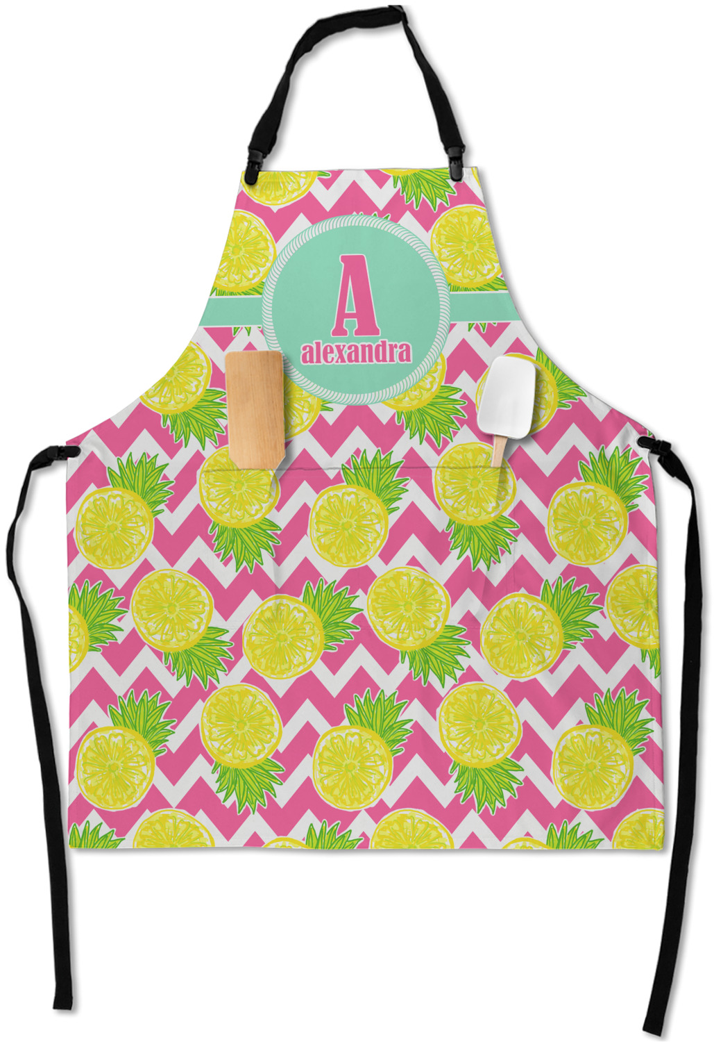 The main design has a background with bright pink and white chevron with some crazy yellow and lime pineapple slices scattered on top. A soft mint color is used for the ribbon and label, while a pink is used for the personalized name and initial.
